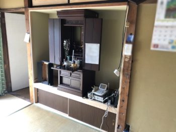 静岡県伊豆の国市和室改修工事最終日です。仏間内部のクロス貼りをりました。 周りの壁にあわせて、和風じゅらく調のリフォームクロスにて仕上げりました。 仏壇の高さも計算し、ぴったり納まりました。 |