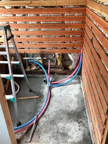 浴室の解体を行い、コンクリートの打設、給排水の配管を行いました。