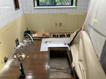 配管関係を移設すると次は大工さんにより床を塞いだり、配管を移設するために空けた壁を塞いでいきます。