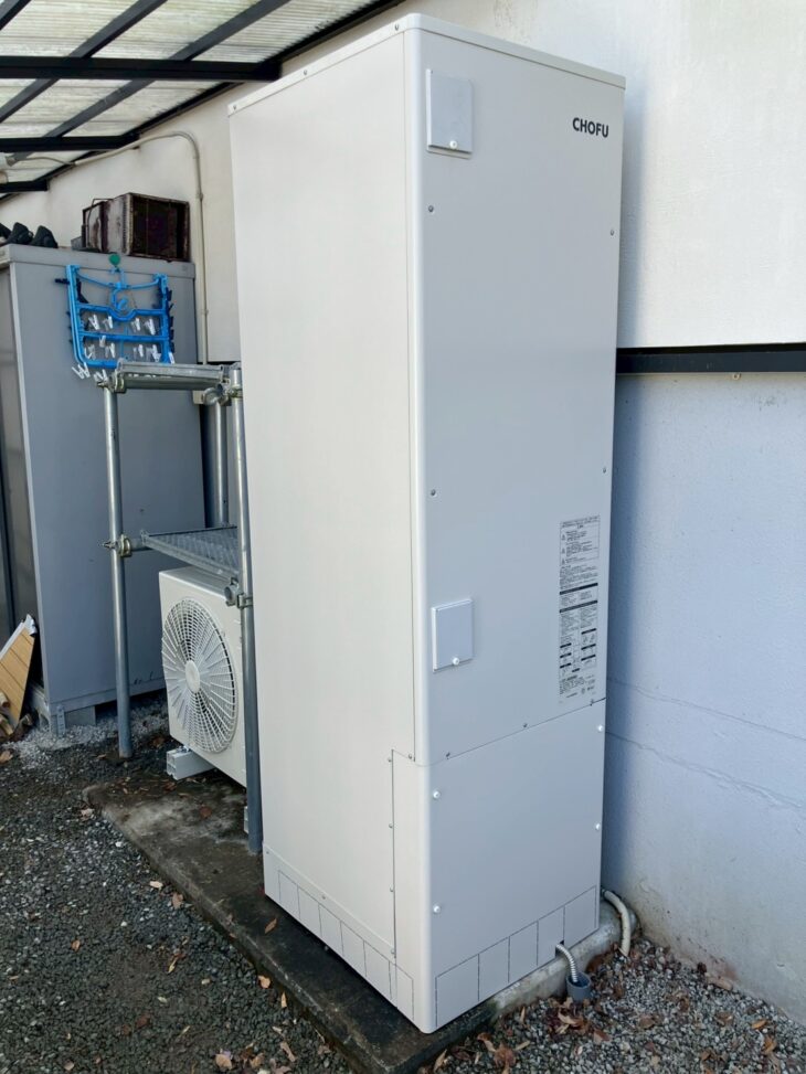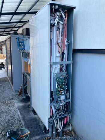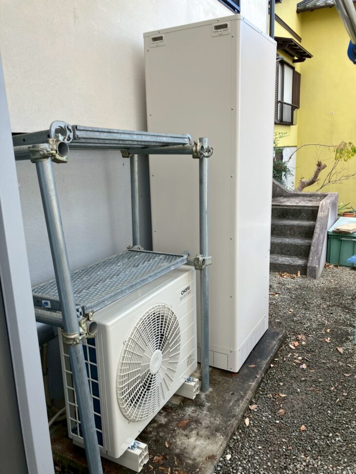 新しいヒートポンプユニットとタンクの新設が完了しました。
