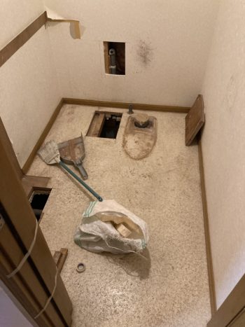まずは既存トイレ、手洗い器を撤去しクロスを剥ぎます。
