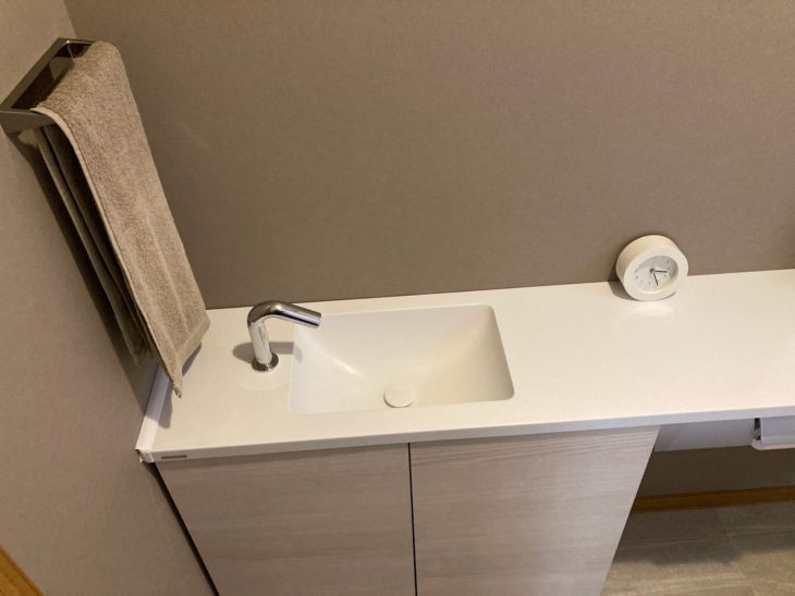 カウンターと手洗い器が一体型なので、ボウルとカウンターの隙間にほこりが溜まることもないですし、天板がフラットなのでお掃除の手間もひとつ減ります。