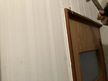 まずドアの周りのコーキングをプロの大工さんの腕で綺麗に取り除いていただきました。