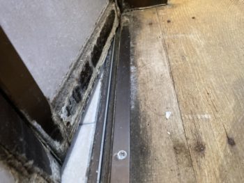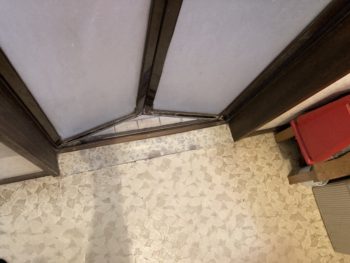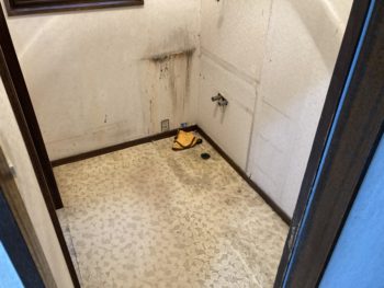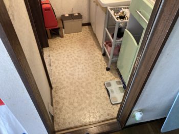 お風呂の入り口の床が、水により弱くなってしまい押すと凹んでしまう状態です。