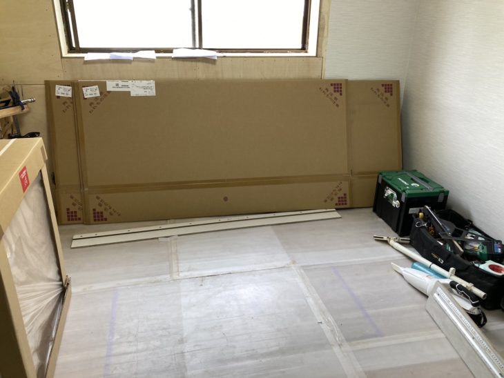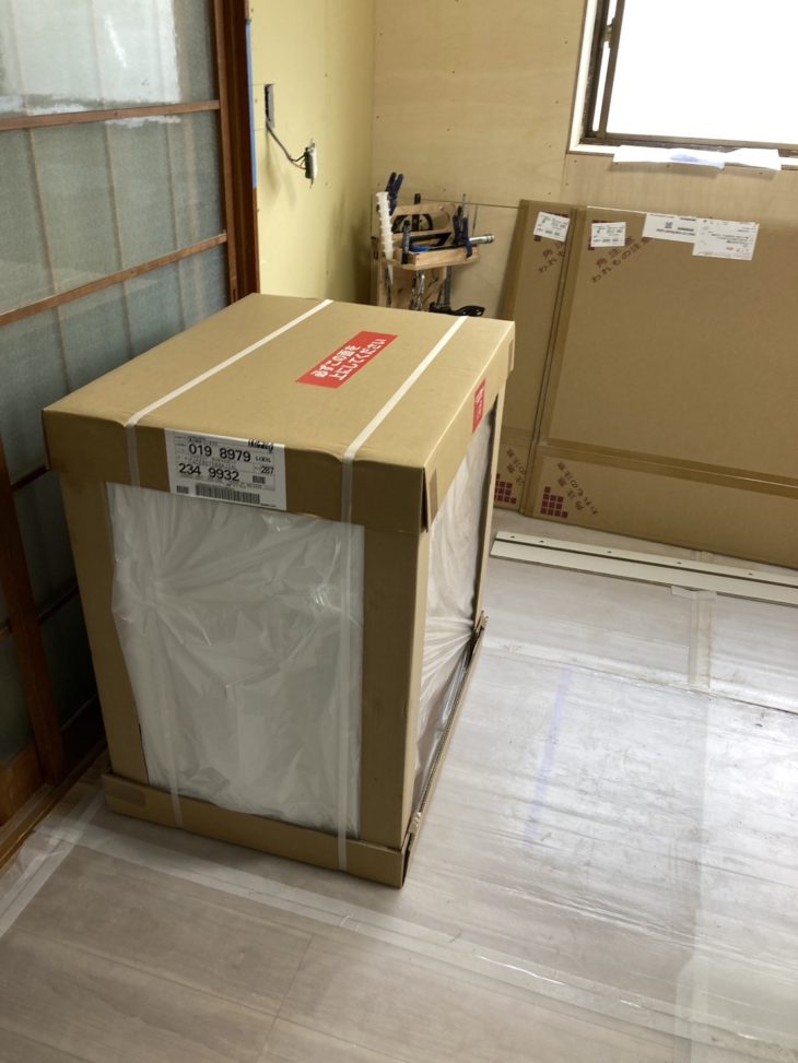 システムキッチンはユニットバス同様パーツがバラバラの状態で届きますのでそれらを室内に運び入れて組み立てます。