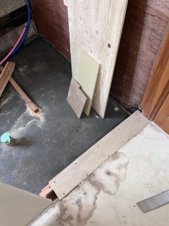 洗濯機の排水を移設する際に床を開けた為、その部分を塞いできます。また、キッチン同様クッションフロアが張られていましたが、キッチンと異なりドアの跨ぎ部分に段差ができていない為、ベニアを増張ってしまうと逆に段差ができてしまいます。