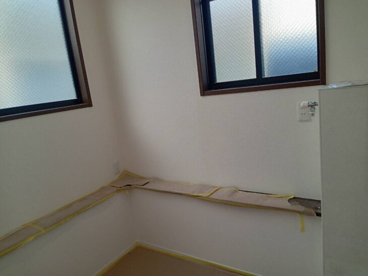 クロス貼りが完了し、床のタイルカーペット貼りも完了した為、床の養生を行います。この後電気と水道器具を取り付ける為、床を汚さないようにするためです。