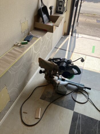 床と壁を見切っている巾木も部分的に腐って破損していた為、建物全周で交換します。巾木は1本4m程度の長さがある為、こういった店舗の場合は加工が少なく施工がしやすいです。