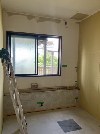 クロス貼りが進んできました。打ったパテは表面が凸凹するので専用の道具でなだらかにしてクロスを貼っていきます。クロスの張替えの場合剥がす手間と剥がしたクロスのごみが出るので、新規で貼るよりも単価が高くなります。