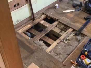 キッチンを解体しました。下地の悪い部分は補修します。 新しいキッチン用に、お湯・お水・排水の場所も変えていきます。 |