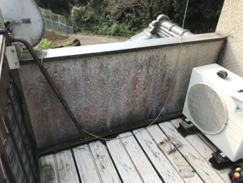 ベランダのモルタル壁の上部に施工されている笠木から雨水の侵入が考えられます。吹上の雨の時、笠木の下からまわったと考えられます。 このまま放置では塗装しても壁が持ちません。 笠木の入れ替えと木下地の補修、モルタルの左官の補修です。 |