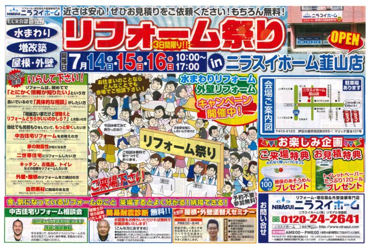 リフォーム価格 屋根診断 来店申し込み 韮山店 三島店 閉じる HOMEイベント情報イベント第97回 住宅リフォーム祭 in ニラスイホーム韮山店 EVENTS 第97回 住宅リフォーム祭 in ニラスイホーム韮山店(終了しました) 一言 ニラスイホーム 韮山店にぜひご来場ください! イベント一覧はこちら チラシ一覧はこちら イベント情報一覧はこちら ニラスイホームについて 会社案内代表挨拶会社概要企業理念アクセスマップ 選ばれる理由 リフォームショールーム ニラスイホーム 伊豆の国韮山店 ニラスイホーム 三島店 スタッフ紹介 採用情報 求職者向け 社長インタビュー 施工事例 施工事例一覧 地域で選ぶ 三島市 沼津市 伊豆の国市 伊豆市 清水町 長泉町 函南町 熱海市 伊東市 御殿場市 リフォームの種類で選ぶ フルリフォーム・リノベーション 水回り3点・4点リフォーム キッチンリフォーム 風呂・浴室リフォーム トイレ・便器の交換リフォーム 洗面台リフォーム エコキュート・給湯器の故障・修理・交換 IHクッキングヒーター・ガスコンロ 内装リフォーム 和室リフォーム 押入れ・クローゼット 建具・内装ドア 玄関ドアの交換 内窓・窓サッシ交換 外壁屋根塗装・外壁補修 外壁サイディング工事 屋根修理・葺き替え ベランダ・バルコニー防水 雨どい交換 外構エクステリア(サンルーム、テラス、ウッドデッキ) 駐車場・カーポート 配管修理・交換 その他 物件種別で選ぶ 一戸建て マンション・アパートのリフォーム 店舗・工場・倉庫、オフィス・事務所 お客様の声 お客様の声一覧 お役立ち情報 節約リフォーム ¥97,900(税込) 浴室 ¥35,200~(税込) TOTO ¥51,260~(税込) キッチン ¥177,100 ~(税込) トイレ ¥97,900(税込) 洗面 ¥60,100(税込) 給湯器 ¥99,800(税込) エコキュート ¥282,700~(税込) 水まわりパック ¥658,000(税込) キッチン水栓 ¥62,920~(税込) 浴室用水栓 ¥23,000(税別) コンロ ¥20,240(税込) 換気扇 ¥11,253~(税込) 外壁・屋根塗装 ¥502,700(税込) 屋根葺き替え・カバー工法 ¥883,000(税込) 窓 ¥26,080~(税込) 玄関ドアの交換・取替リフォーム ¥261,800~(税込) ニラスイホームのリフォーム応援セール!お得に快適生活を手に入れよう! 三島・沼津・伊豆の国周辺でエコキュートの故障・修理・交換ならニラスイホーム ニラスイホームの水まわり4点パックキャンペーン 補助金を使ってお得に内窓リフォーム! マンション水まわり3点セットキャンペーン リフォーム費用・相場 LINEで簡単相談・見積もり 現場ブログ イベント・チラシ情報 バリアフリーリフォーム リフォーム価格表 キッチン 浴室 トイレ 洗面 外壁・屋根塗装 屋根診断 協力施工業者大募集 住宅省エネ2026キャンペーン 先進的窓リノベ2026事業 みらいエコ住宅2026事業 給湯省エネ2026事業 よくあるご質問 お問い合わせ お問い合わせ お見積もり ご来店申し込み LINEで簡単相談・見積もり 韮山店 三島店 © 2018 ニラスイホーム株式会社