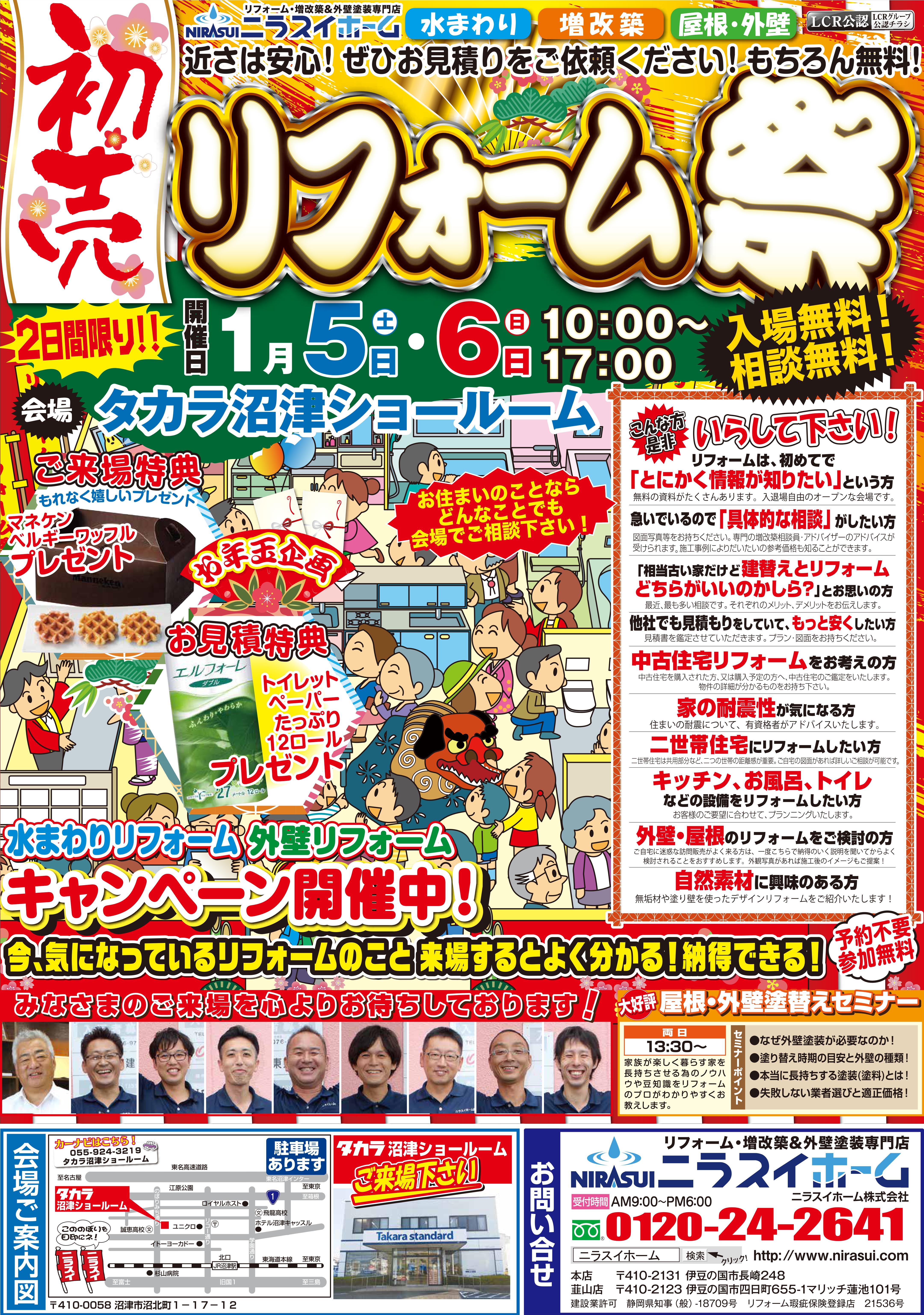 リフォーム価格 屋根診断 来店申し込み 韮山店 三島店 閉じる HOMEイベント情報イベント2019年1月5日(土)・6日(日)初売!リフォーム祭 in タカラ沼津ショールーム EVENTS 2019年1月5日(土)・6日(日)初売!リフォーム祭 in タカラ沼津ショールーム(終了しました) 一言 初売 リフォーム祭 タカラ沼津ショールームへ是非ご来場ください! イベント一覧はこちら チラシ一覧はこちら イベント情報一覧はこちら ニラスイホームについて 会社案内代表挨拶会社概要企業理念アクセスマップ 選ばれる理由 リフォームショールーム ニラスイホーム 伊豆の国韮山店 ニラスイホーム 三島店 スタッフ紹介 採用情報 求職者向け 社長インタビュー 施工事例 施工事例一覧 地域で選ぶ 三島市 沼津市 伊豆の国市 伊豆市 清水町 長泉町 函南町 熱海市 伊東市 御殿場市 リフォームの種類で選ぶ フルリフォーム・リノベーション 水回り3点・4点リフォーム キッチンリフォーム 風呂・浴室リフォーム トイレ・便器の交換リフォーム 洗面台リフォーム エコキュート・給湯器の故障・修理・交換 IHクッキングヒーター・ガスコンロ 内装リフォーム 和室リフォーム 押入れ・クローゼット 建具・内装ドア 玄関ドアの交換 内窓・窓サッシ交換 外壁屋根塗装・外壁補修 外壁サイディング工事 屋根修理・葺き替え ベランダ・バルコニー防水 雨どい交換 外構エクステリア(サンルーム、テラス、ウッドデッキ) 駐車場・カーポート 配管修理・交換 その他 物件種別で選ぶ 一戸建て マンション・アパートのリフォーム 店舗・工場・倉庫、オフィス・事務所 お客様の声 お客様の声一覧 お役立ち情報 節約リフォーム ¥59,800(税込) 浴室 ¥35,200~(税込) TOTO ¥51,260~(税込) キッチン ¥177,100 ~(税込) トイレ ¥59,800(税込) 洗面 ¥60,100(税込) 給湯器 ¥58,500(税込) エコキュート ¥282,700~(税込) 水まわりパック ¥658,000(税込) キッチン水栓 ¥62,920~(税込) 浴室用水栓 ¥23,000(税別) コンロ ¥20,240(税込) 換気扇 ¥11,253~(税込) 外壁・屋根塗装 ¥502,700(税込) 屋根葺き替え・カバー工法 ¥883,000(税込) 窓 ¥26,080~(税込) 玄関ドアの交換・取替リフォーム ¥261,800~(税込) WEB限定価格!年に1度のリフォーム大特価祭!新春初売りリフォームセール! 三島・沼津・伊豆の国周辺でエコキュートの故障・修理・交換ならニラスイホーム ニラスイホームの水まわり4点パックキャンペーン マンション水まわり3点セットキャンペーン リフォーム費用・相場 LINEで簡単相談・見積もり 現場ブログ イベント・チラシ情報 バリアフリーリフォーム リフォーム価格表 キッチン 浴室 トイレ 洗面 外壁・屋根塗装 屋根診断 協力施工業者大募集 住宅省エネ2026キャンペーン 先進的窓リノベ2026事業 みらいエコ住宅2026事業 給湯省エネ2026事業 よくあるご質問 お問い合わせ お問い合わせ お見積もり ご来店申し込み LINEで簡単相談・見積もり 韮山店 三島店 © 2018 ニラスイホーム株式会社