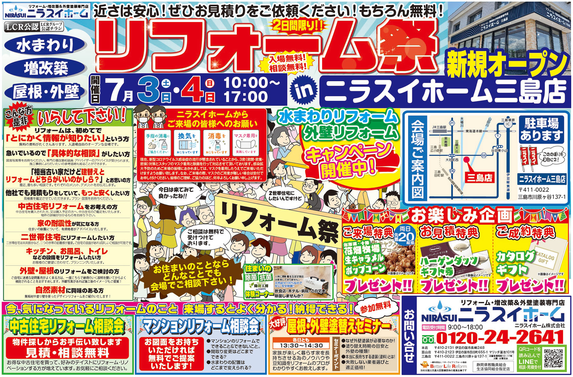 ニラスイホーム三島店の新規オープンを記念して、7月3日(土)・7月4日(日)にリフォーム祭を開催いたします!