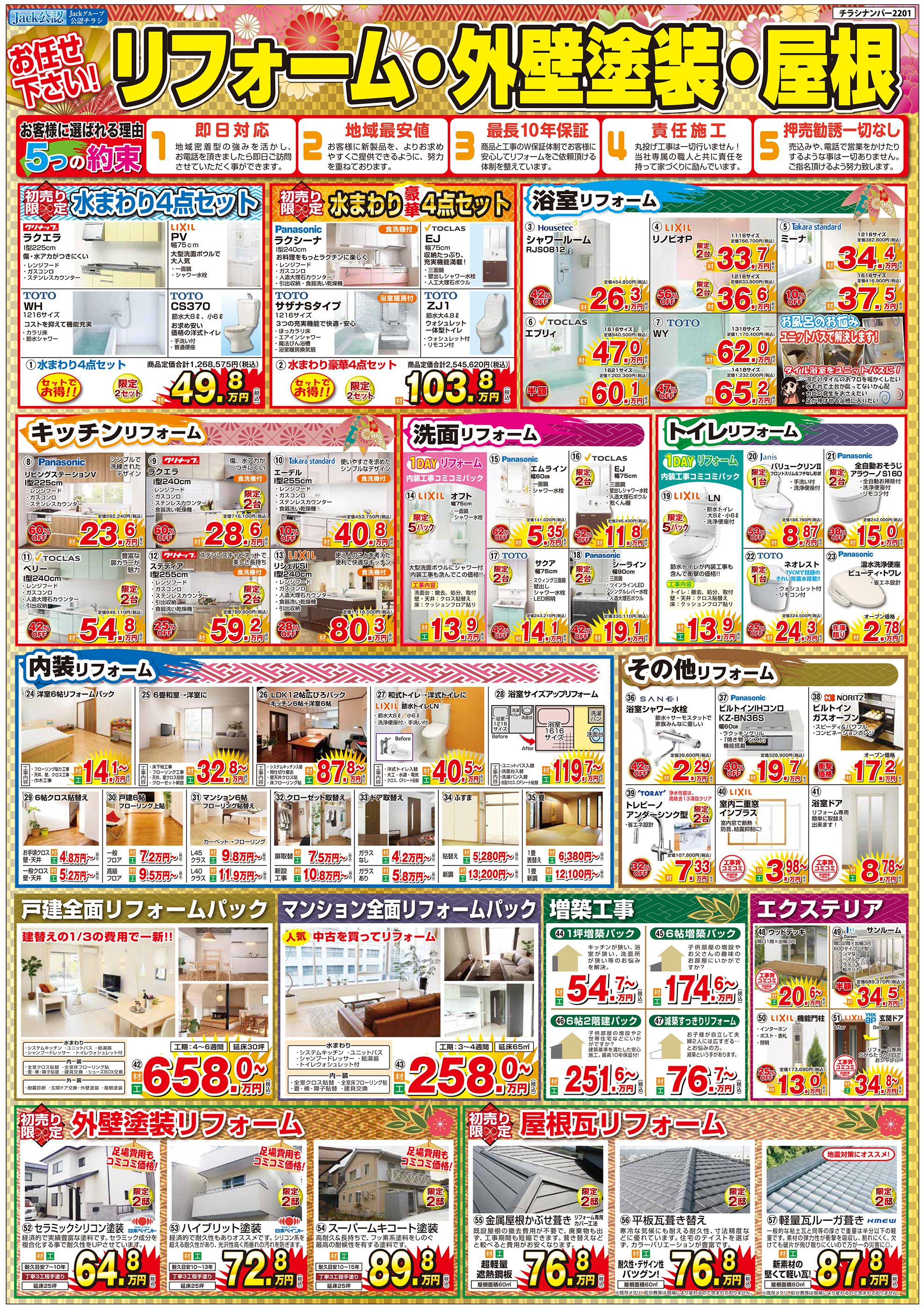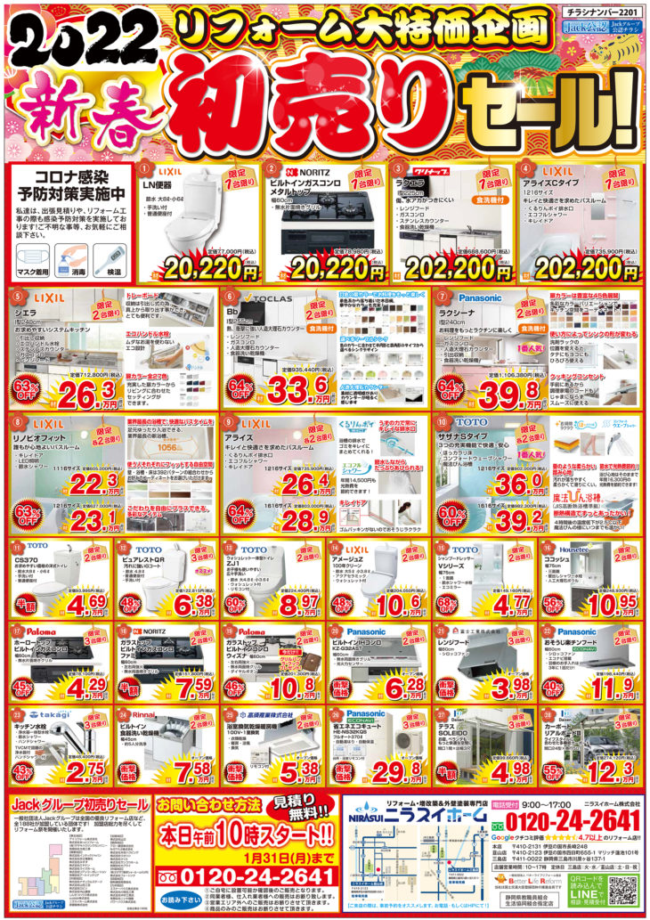 リフォーム価格 屋根診断 来店申し込み 韮山店 三島店 閉じる HOMEイベント情報チラシ2022年新春リフォーム大特価企画初売りセールチラシです! EVENTS 2022年新春リフォーム大特価企画初売りセールチラシです!(終了しました) 1 即日対応! 地域密着型の強みを活かし、お電話頂いたら即日対応させていただきます。2 地域最安値 お客様に良いものを、よりお求めやすくご提供できるように、努力を重ねております。3 最長10年保証 商品と工事のW保証体制でお客様に安心してリフォームをご依頼いただける体制を整えています。4 責任施工 丸投げ工事は一切行いません!当社専属の職人と共に責任を持って家づくりに励んでいます。5 押売勧誘一切なし 無理な売り込みや、電話で営業をかけたりするような事は一切ありません。 一言 お見積り無料!まずはお電話下さい!! 必須お名前 必須電話番号 必須イベント名 任意参加希望日 —以下から選択してください— 任意会場名 任意参加人数 任意メールアドレス 任意郵便番号 住所検索 任意住所 任意お問い合わせ内容 ※お急ぎの方は、 直接 0120-24-2641(10:00~17:00)まで、お電話ください。 ※相談内容は個人情報保護法に適用いたします。 24時間以内に回答を心がけておりますが、相談内容等によって、 2〜3日かかる事もございますが御了承下さい。 お電話でもお気軽にどうぞ! 内容をご確認の上、よろしければ下記の「入力内容を確認する」ボタンを押して下さい。 個人情報利用目的 ・お客様のご要望に合わせたサービスを提供させていただくための各種ご連絡。 ・お問い合わせいただいたご質問への回答のご連絡。 尚、お客様から収集する個人情報は弊社の定めるプライバシーポリシーに則って厳重に管理いたします。 プライバシーポリシー 弊社では、利用者のみなさんの個人情報がきちんと守られることを、何よりも大切にしています。また、利用者ご本人への事前の許可なしに第三者に個人情報を配送作業以外に開示することは絶対にいたしません。 どんな些細な事でも結構です。ご相談、お見積もりなど、お気軽にご連絡下さい。上記メールフォームからご連絡いただくか、電話にてご連絡下さい。 必須マークがついている項目は必ずご記載下さい。(株)、(有)や丸囲み数字等の機種依存文字は、文字化けの原因となりますので、使用しないようお願いいたします。 チラシ一覧はこちら イベント情報一覧はこちら ニラスイホームについて 会社案内代表挨拶会社概要企業理念アクセスマップ 選ばれる理由 リフォームショールーム ニラスイホーム 伊豆の国韮山店 ニラスイホーム 三島店 スタッフ紹介 採用情報 求職者向け 社長インタビュー 施工事例 施工事例一覧 地域で選ぶ 三島市 沼津市 伊豆の国市 伊豆市 清水町 長泉町 函南町 熱海市 伊東市 御殿場市 リフォームの種類で選ぶ フルリフォーム・リノベーション 水回り3点・4点リフォーム キッチンリフォーム 風呂・浴室リフォーム トイレ・便器の交換リフォーム 洗面台リフォーム エコキュート・給湯器の故障・修理・交換 IHクッキングヒーター・ガスコンロ 内装リフォーム 和室リフォーム 押入れ・クローゼット 建具・内装ドア 玄関ドアの交換 内窓・窓サッシ交換 外壁屋根塗装・外壁補修 外壁サイディング工事 屋根修理・葺き替え ベランダ・バルコニー防水 雨どい交換 外構エクステリア(サンルーム、テラス、ウッドデッキ) 駐車場・カーポート 配管修理・交換 その他 物件種別で選ぶ 一戸建て マンション・アパートのリフォーム 店舗・工場・倉庫、オフィス・事務所 お客様の声 お客様の声一覧 お役立ち情報 節約リフォーム ¥97,900(税込) 浴室 ¥35,200~(税込) TOTO ¥51,260~(税込) キッチン ¥177,100 ~(税込) トイレ ¥97,900(税込) 洗面 ¥60,100(税込) 給湯器 ¥99,800(税込) エコキュート ¥282,700~(税込) 水まわりパック ¥658,000(税込) キッチン水栓 ¥62,920~(税込) 浴室用水栓 ¥23,000(税別) コンロ ¥20,240(税込) 換気扇 ¥11,253~(税込) 外壁・屋根塗装 ¥502,700(税込) 屋根葺き替え・カバー工法 ¥883,000(税込) 窓 ¥26,080~(税込) 玄関ドアの交換・取替リフォーム ¥261,800~(税込) ニラスイホームのリフォーム応援セール!お得に快適生活を手に入れよう! 三島・沼津・伊豆の国周辺でエコキュートの故障・修理・交換ならニラスイホーム ニラスイホームの水まわり4点パックキャンペーン 補助金を使ってお得に内窓リフォーム! マンション水まわり3点セットキャンペーン リフォーム費用・相場 LINEで簡単相談・見積もり 現場ブログ イベント・チラシ情報 バリアフリーリフォーム リフォーム価格表 キッチン 浴室 トイレ 洗面 外壁・屋根塗装 屋根診断 協力施工業者大募集 住宅省エネ2026キャンペーン 先進的窓リノベ2026事業 みらいエコ住宅2026事業 給湯省エネ2026事業 よくあるご質問 お問い合わせ お問い合わせ お見積もり ご来店申し込み LINEで簡単相談・見積もり 韮山店 三島店 © 2018 ニラスイホーム株式会社