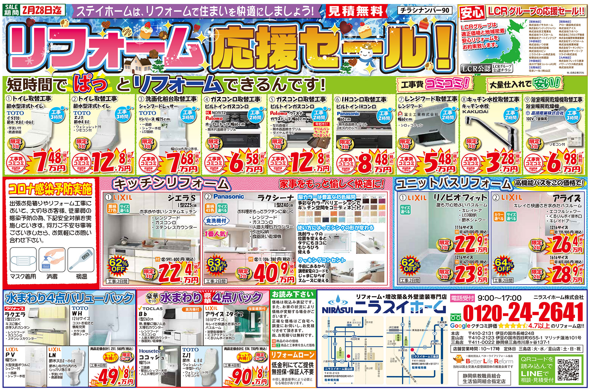 リフォーム価格 屋根診断 来店申し込み 韮山店 三島店 閉じる HOMEイベント情報チラシ【2月末までの期間限定】リフォーム応援セールチラシです! EVENTS 【2月末までの期間限定】リフォーム応援セールチラシです!(終了しました) 1 即日対応! 地域密着型の強みを活かし、お電話頂いたら即日対応させていただきます。2 地域最安値 お客様に良いものを、よりお求めやすくご提供できるように、努力を重ねております。3 最長10年保証 商品と工事のW保証体制でお客様に安心してリフォームをご依頼いただける体制を整えています。4 責任施工 丸投げ工事は一切行いません!当社専属の職人と共に責任を持って家づくりに励んでいます。5 押売勧誘一切なし 無理な売り込みや、電話で営業をかけたりするような事は一切ありません。 一言 お見積り無料!まずはお電話下さい!! チラシ一覧はこちら イベント情報一覧はこちら ニラスイホームについて 会社案内代表挨拶会社概要企業理念アクセスマップ 選ばれる理由 リフォームショールーム ニラスイホーム 伊豆の国韮山店 ニラスイホーム 三島店 スタッフ紹介 採用情報 求職者向け 社長インタビュー 施工事例 施工事例一覧 地域で選ぶ 三島市 沼津市 伊豆の国市 伊豆市 清水町 長泉町 函南町 熱海市 伊東市 御殿場市 リフォームの種類で選ぶ フルリフォーム・リノベーション 水回り3点・4点リフォーム キッチンリフォーム 風呂・浴室リフォーム トイレ・便器の交換リフォーム 洗面台リフォーム エコキュート・給湯器の故障・修理・交換 IHクッキングヒーター・ガスコンロ 内装リフォーム 和室リフォーム 押入れ・クローゼット 建具・内装ドア 玄関ドアの交換 内窓・窓サッシ交換 外壁屋根塗装・外壁補修 外壁サイディング工事 屋根修理・葺き替え ベランダ・バルコニー防水 雨どい交換 外構エクステリア(サンルーム、テラス、ウッドデッキ) 駐車場・カーポート 配管修理・交換 その他 物件種別で選ぶ 一戸建て マンション・アパートのリフォーム 店舗・工場・倉庫、オフィス・事務所 お客様の声 お客様の声一覧 お役立ち情報 節約リフォーム ¥97,900(税込) 浴室 ¥35,200~(税込) TOTO ¥51,260~(税込) キッチン ¥177,100 ~(税込) トイレ ¥97,900(税込) 洗面 ¥60,100(税込) 給湯器 ¥99,800(税込) エコキュート ¥282,700~(税込) 水まわりパック ¥658,000(税込) キッチン水栓 ¥62,920~(税込) 浴室用水栓 ¥23,000(税別) コンロ ¥20,240(税込) 換気扇 ¥11,253~(税込) 外壁・屋根塗装 ¥502,700(税込) 屋根葺き替え・カバー工法 ¥883,000(税込) 窓 ¥26,080~(税込) 玄関ドアの交換・取替リフォーム ¥261,800~(税込) ニラスイホームのリフォーム応援セール!お得に快適生活を手に入れよう! 三島・沼津・伊豆の国周辺でエコキュートの故障・修理・交換ならニラスイホーム ニラスイホームの水まわり4点パックキャンペーン 補助金を使ってお得に内窓リフォーム! マンション水まわり3点セットキャンペーン リフォーム費用・相場 LINEで簡単相談・見積もり 現場ブログ イベント・チラシ情報 バリアフリーリフォーム リフォーム価格表 キッチン 浴室 トイレ 洗面 外壁・屋根塗装 屋根診断 協力施工業者大募集 住宅省エネ2026キャンペーン 先進的窓リノベ2026事業 みらいエコ住宅2026事業 給湯省エネ2026事業 よくあるご質問 お問い合わせ お問い合わせ お見積もり ご来店申し込み LINEで簡単相談・見積もり 韮山店 三島店 © 2018 ニラスイホーム株式会社