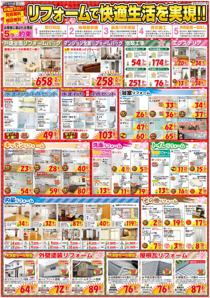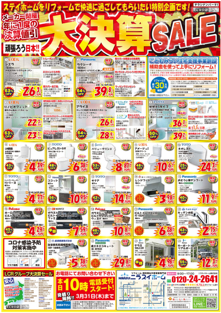 リフォーム価格 屋根診断 来店申し込み 韮山店 三島店 閉じる HOMEイベント情報チラシ【3月末までの期間限定】LCRグループ大決算セールチラシです! EVENTS 【3月末までの期間限定】LCRグループ大決算セールチラシです!(終了しました) 1 即日対応! 地域密着型の強みを活かし、お電話頂いたら即日対応させていただきます。2 地域最安値 お客様に良いものを、よりお求めやすくご提供できるように、努力を重ねております。3 最長10年保証 商品と工事のW保証体制でお客様に安心してリフォームをご依頼いただける体制を整えています。4 責任施工 丸投げ工事は一切行いません!当社専属の職人と共に責任を持って家づくりに励んでいます。5 押売勧誘一切なし 無理な売り込みや、電話で営業をかけたりするような事は一切ありません。 一言 メーカー問屋年に一度の決算値引き!お見積り無料!まずはお電話下さい!! 必須お名前 必須電話番号 必須イベント名 任意参加希望日 —以下から選択してください— 任意会場名 任意参加人数 任意メールアドレス 任意郵便番号 住所検索 任意住所 任意お問い合わせ内容 ※お急ぎの方は、 直接 0120-24-2641(10:00~17:00)まで、お電話ください。 ※相談内容は個人情報保護法に適用いたします。 24時間以内に回答を心がけておりますが、相談内容等によって、 2〜3日かかる事もございますが御了承下さい。 お電話でもお気軽にどうぞ! 内容をご確認の上、よろしければ下記の「入力内容を確認する」ボタンを押して下さい。 個人情報利用目的 ・お客様のご要望に合わせたサービスを提供させていただくための各種ご連絡。 ・お問い合わせいただいたご質問への回答のご連絡。 尚、お客様から収集する個人情報は弊社の定めるプライバシーポリシーに則って厳重に管理いたします。 プライバシーポリシー 弊社では、利用者のみなさんの個人情報がきちんと守られることを、何よりも大切にしています。また、利用者ご本人への事前の許可なしに第三者に個人情報を配送作業以外に開示することは絶対にいたしません。 どんな些細な事でも結構です。ご相談、お見積もりなど、お気軽にご連絡下さい。上記メールフォームからご連絡いただくか、電話にてご連絡下さい。 必須マークがついている項目は必ずご記載下さい。(株)、(有)や丸囲み数字等の機種依存文字は、文字化けの原因となりますので、使用しないようお願いいたします。 チラシ一覧はこちら イベント情報一覧はこちら ニラスイホームについて 会社案内代表挨拶会社概要企業理念アクセスマップ 選ばれる理由 リフォームショールーム ニラスイホーム 伊豆の国韮山店 ニラスイホーム 三島店 スタッフ紹介 採用情報 求職者向け 社長インタビュー 施工事例 施工事例一覧 地域で選ぶ 三島市 沼津市 伊豆の国市 伊豆市 清水町 長泉町 函南町 熱海市 伊東市 御殿場市 リフォームの種類で選ぶ フルリフォーム・リノベーション 水回り3点・4点リフォーム キッチンリフォーム 風呂・浴室リフォーム トイレ・便器の交換リフォーム 洗面台リフォーム エコキュート・給湯器の故障・修理・交換 IHクッキングヒーター・ガスコンロ 内装リフォーム 和室リフォーム 押入れ・クローゼット 建具・内装ドア 玄関ドアの交換 内窓・窓サッシ交換 外壁屋根塗装・外壁補修 外壁サイディング工事 屋根修理・葺き替え ベランダ・バルコニー防水 雨どい交換 外構エクステリア(サンルーム、テラス、ウッドデッキ) 駐車場・カーポート 配管修理・交換 その他 物件種別で選ぶ 一戸建て マンション・アパートのリフォーム 店舗・工場・倉庫、オフィス・事務所 お客様の声 お客様の声一覧 お役立ち情報 節約リフォーム ¥59,800(税込) 浴室 ¥35,200~(税込) TOTO ¥51,260~(税込) キッチン ¥177,100 ~(税込) トイレ ¥59,800(税込) 洗面 ¥60,100(税込) 給湯器 ¥58,500(税込) エコキュート ¥282,700~(税込) 水まわりパック ¥658,000(税込) キッチン水栓 ¥62,920~(税込) 浴室用水栓 ¥23,000(税別) コンロ ¥20,240(税込) 換気扇 ¥11,253~(税込) 外壁・屋根塗装 ¥502,700(税込) 屋根葺き替え・カバー工法 ¥883,000(税込) 窓 ¥26,080~(税込) 玄関ドアの交換・取替リフォーム ¥261,800~(税込) WEB限定価格!年に1度のリフォーム大特価祭!新春初売りリフォームセール! 三島・沼津・伊豆の国周辺でエコキュートの故障・修理・交換ならニラスイホーム ニラスイホームの水まわり4点パックキャンペーン マンション水まわり3点セットキャンペーン リフォーム費用・相場 LINEで簡単相談・見積もり 現場ブログ イベント・チラシ情報 バリアフリーリフォーム リフォーム価格表 キッチン 浴室 トイレ 洗面 外壁・屋根塗装 屋根診断 協力施工業者大募集 住宅省エネ2026キャンペーン 先進的窓リノベ2026事業 みらいエコ住宅2026事業 給湯省エネ2026事業 よくあるご質問 お問い合わせ お問い合わせ お見積もり ご来店申し込み LINEで簡単相談・見積もり 韮山店 三島店 © 2018 ニラスイホーム株式会社