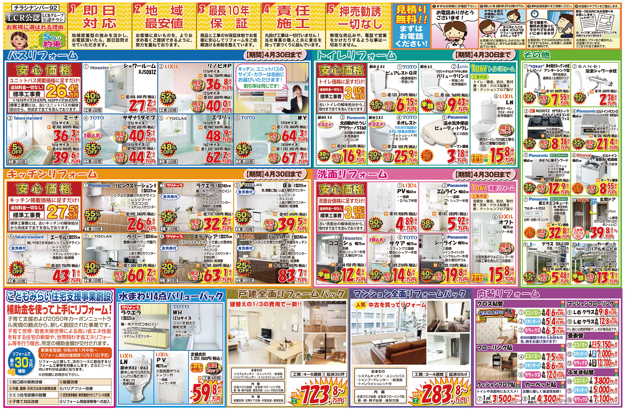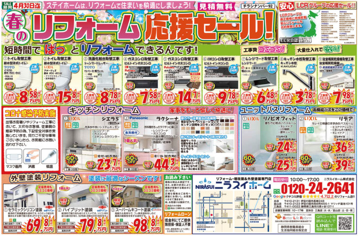 リフォーム価格 屋根診断 来店申し込み 韮山店 三島店 閉じる HOMEイベント情報チラシ【4月末までの期間限定】春のリフォーム応援セールチラシです! EVENTS 【4月末までの期間限定】春のリフォーム応援セールチラシです!(終了しました) 1 即日対応! 地域密着型の強みを活かし、お電話頂いたら即日対応させていただきます。2 地域最安値 お客様に良いものを、よりお求めやすくご提供できるように、努力を重ねております。3 最長10年保証 商品と工事のW保証体制でお客様に安心してリフォームをご依頼いただける体制を整えています。4 責任施工 丸投げ工事は一切行いません!当社専属の職人と共に責任を持って家づくりに励んでいます。5 押売勧誘一切なし 無理な売り込みや、電話で営業をかけたりするような事は一切ありません。 一言 お見積り無料!まずはお電話下さい!! 必須お名前 必須電話番号 必須イベント名 任意参加希望日 —以下から選択してください— 任意会場名 任意参加人数 任意メールアドレス 任意郵便番号 住所検索 任意住所 任意お問い合わせ内容 ※お急ぎの方は、 直接 0120-24-2641(10:00~17:00)まで、お電話ください。 ※相談内容は個人情報保護法に適用いたします。 24時間以内に回答を心がけておりますが、相談内容等によって、 2〜3日かかる事もございますが御了承下さい。 お電話でもお気軽にどうぞ! 内容をご確認の上、よろしければ下記の「入力内容を確認する」ボタンを押して下さい。 個人情報利用目的 ・お客様のご要望に合わせたサービスを提供させていただくための各種ご連絡。 ・お問い合わせいただいたご質問への回答のご連絡。 尚、お客様から収集する個人情報は弊社の定めるプライバシーポリシーに則って厳重に管理いたします。 プライバシーポリシー 弊社では、利用者のみなさんの個人情報がきちんと守られることを、何よりも大切にしています。また、利用者ご本人への事前の許可なしに第三者に個人情報を配送作業以外に開示することは絶対にいたしません。 どんな些細な事でも結構です。ご相談、お見積もりなど、お気軽にご連絡下さい。上記メールフォームからご連絡いただくか、電話にてご連絡下さい。 必須マークがついている項目は必ずご記載下さい。(株)、(有)や丸囲み数字等の機種依存文字は、文字化けの原因となりますので、使用しないようお願いいたします。 チラシ一覧はこちら イベント情報一覧はこちら ニラスイホームについて 会社案内代表挨拶会社概要企業理念アクセスマップ 選ばれる理由 リフォームショールーム ニラスイホーム 伊豆の国韮山店 ニラスイホーム 三島店 スタッフ紹介 採用情報 求職者向け 社長インタビュー 施工事例 施工事例一覧 地域で選ぶ 三島市 沼津市 伊豆の国市 伊豆市 清水町 長泉町 函南町 熱海市 伊東市 御殿場市 リフォームの種類で選ぶ フルリフォーム・リノベーション 水回り3点・4点リフォーム キッチンリフォーム 風呂・浴室リフォーム トイレ・便器の交換リフォーム 洗面台リフォーム エコキュート・給湯器の故障・修理・交換 IHクッキングヒーター・ガスコンロ 内装リフォーム 和室リフォーム 押入れ・クローゼット 建具・内装ドア 玄関ドアの交換 内窓・窓サッシ交換 外壁屋根塗装・外壁補修 外壁サイディング工事 屋根修理・葺き替え ベランダ・バルコニー防水 雨どい交換 外構エクステリア(サンルーム、テラス、ウッドデッキ) 駐車場・カーポート 配管修理・交換 その他 物件種別で選ぶ 一戸建て マンション・アパートのリフォーム 店舗・工場・倉庫、オフィス・事務所 お客様の声 お客様の声一覧 お役立ち情報 節約リフォーム ¥97,900(税込) 浴室 ¥35,200~(税込) TOTO ¥51,260~(税込) キッチン ¥177,100 ~(税込) トイレ ¥97,900(税込) 洗面 ¥60,100(税込) 給湯器 ¥99,800(税込) エコキュート ¥282,700~(税込) 水まわりパック ¥658,000(税込) キッチン水栓 ¥62,920~(税込) 浴室用水栓 ¥23,000(税別) コンロ ¥20,240(税込) 換気扇 ¥11,253~(税込) 外壁・屋根塗装 ¥502,700(税込) 屋根葺き替え・カバー工法 ¥883,000(税込) 窓 ¥26,080~(税込) 玄関ドアの交換・取替リフォーム ¥261,800~(税込) ニラスイホームのリフォーム応援セール!お得に快適生活を手に入れよう! 三島・沼津・伊豆の国周辺でエコキュートの故障・修理・交換ならニラスイホーム ニラスイホームの水まわり4点パックキャンペーン 補助金を使ってお得に内窓リフォーム! マンション水まわり3点セットキャンペーン リフォーム費用・相場 LINEで簡単相談・見積もり 現場ブログ イベント・チラシ情報 バリアフリーリフォーム リフォーム価格表 キッチン 浴室 トイレ 洗面 外壁・屋根塗装 屋根診断 協力施工業者大募集 住宅省エネ2026キャンペーン 先進的窓リノベ2026事業 みらいエコ住宅2026事業 給湯省エネ2026事業 よくあるご質問 お問い合わせ お問い合わせ お見積もり ご来店申し込み LINEで簡単相談・見積もり 韮山店 三島店 © 2018 ニラスイホーム株式会社