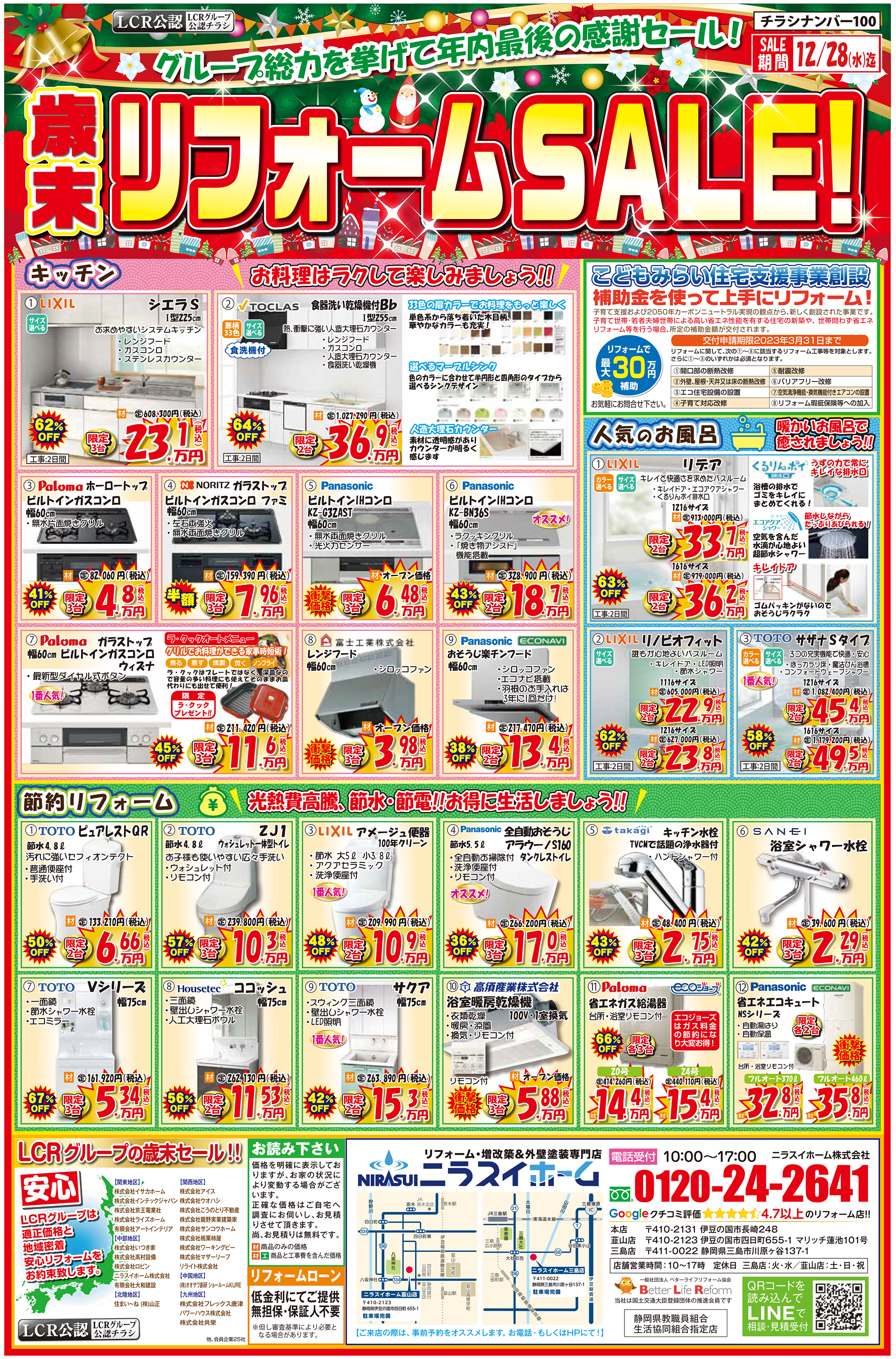 リフォーム価格 屋根診断 来店申し込み 韮山店 三島店 閉じる HOMEイベント情報チラシ【12月末までの期間限定】歳末リフォームセールチラシです! EVENTS 【12月末までの期間限定】歳末リフォームセールチラシです!(終了しました) 1 即日対応! 地域密着型の強みを活かし、お電話頂いたら即日対応させていただきます。2 地域最安値 お客様に良いものを、よりお求めやすくご提供できるように、努力を重ねております。3 最長10年保証 商品と工事のW保証体制でお客様に安心してリフォームをご依頼いただける体制を整えています。4 責任施工 丸投げ工事は一切行いません!当社専属の職人と共に責任を持って家づくりに励んでいます。5 押売勧誘一切なし 無理な売り込みや、電話で営業をかけたりするような事は一切ありません。 一言 お見積り無料!まずはお電話下さい!! 必須お名前 必須電話番号 必須イベント名 任意参加希望日 —以下から選択してください— 任意会場名 任意参加人数 任意メールアドレス 任意郵便番号 住所検索 任意住所 任意お問い合わせ内容 ※お急ぎの方は、 直接 0120-24-2641(10:00~17:00)まで、お電話ください。 ※相談内容は個人情報保護法に適用いたします。 24時間以内に回答を心がけておりますが、相談内容等によって、 2〜3日かかる事もございますが御了承下さい。 お電話でもお気軽にどうぞ! 内容をご確認の上、よろしければ下記の「入力内容を確認する」ボタンを押して下さい。 個人情報利用目的 ・お客様のご要望に合わせたサービスを提供させていただくための各種ご連絡。 ・お問い合わせいただいたご質問への回答のご連絡。 尚、お客様から収集する個人情報は弊社の定めるプライバシーポリシーに則って厳重に管理いたします。 プライバシーポリシー 弊社では、利用者のみなさんの個人情報がきちんと守られることを、何よりも大切にしています。また、利用者ご本人への事前の許可なしに第三者に個人情報を配送作業以外に開示することは絶対にいたしません。 どんな些細な事でも結構です。ご相談、お見積もりなど、お気軽にご連絡下さい。上記メールフォームからご連絡いただくか、電話にてご連絡下さい。 必須マークがついている項目は必ずご記載下さい。(株)、(有)や丸囲み数字等の機種依存文字は、文字化けの原因となりますので、使用しないようお願いいたします。 チラシ一覧はこちら イベント情報一覧はこちら ニラスイホームについて 会社案内代表挨拶会社概要企業理念アクセスマップ 選ばれる理由 リフォームショールーム ニラスイホーム 伊豆の国韮山店 ニラスイホーム 三島店 スタッフ紹介 採用情報 求職者向け 社長インタビュー 施工事例 施工事例一覧 地域で選ぶ 三島市 沼津市 伊豆の国市 伊豆市 清水町 長泉町 函南町 熱海市 伊東市 御殿場市 リフォームの種類で選ぶ フルリフォーム・リノベーション 水回り3点・4点リフォーム キッチンリフォーム 風呂・浴室リフォーム トイレ・便器の交換リフォーム 洗面台リフォーム エコキュート・給湯器の故障・修理・交換 IHクッキングヒーター・ガスコンロ 内装リフォーム 和室リフォーム 押入れ・クローゼット 建具・内装ドア 玄関ドアの交換 内窓・窓サッシ交換 外壁屋根塗装・外壁補修 外壁サイディング工事 屋根修理・葺き替え ベランダ・バルコニー防水 雨どい交換 外構エクステリア(サンルーム、テラス、ウッドデッキ) 駐車場・カーポート 配管修理・交換 その他 物件種別で選ぶ 一戸建て マンション・アパートのリフォーム 店舗・工場・倉庫、オフィス・事務所 お客様の声 お客様の声一覧 お役立ち情報 節約リフォーム ¥59,800(税込) 浴室 ¥35,200~(税込) TOTO ¥51,260~(税込) キッチン ¥177,100 ~(税込) トイレ ¥59,800(税込) 洗面 ¥60,100(税込) 給湯器 ¥58,500(税込) エコキュート ¥282,700~(税込) 水まわりパック ¥658,000(税込) キッチン水栓 ¥62,920~(税込) 浴室用水栓 ¥23,000(税別) コンロ ¥20,240(税込) 換気扇 ¥11,253~(税込) 外壁・屋根塗装 ¥502,700(税込) 屋根葺き替え・カバー工法 ¥883,000(税込) 窓 ¥26,080~(税込) 玄関ドアの交換・取替リフォーム ¥261,800~(税込) WEB限定価格!年に1度のリフォーム大特価祭!新春初売りリフォームセール! 三島・沼津・伊豆の国周辺でエコキュートの故障・修理・交換ならニラスイホーム ニラスイホームの水まわり4点パックキャンペーン マンション水まわり3点セットキャンペーン リフォーム費用・相場 LINEで簡単相談・見積もり 現場ブログ イベント・チラシ情報 バリアフリーリフォーム リフォーム価格表 キッチン 浴室 トイレ 洗面 外壁・屋根塗装 屋根診断 協力施工業者大募集 住宅省エネ2026キャンペーン 先進的窓リノベ2026事業 みらいエコ住宅2026事業 給湯省エネ2026事業 よくあるご質問 お問い合わせ お問い合わせ お見積もり ご来店申し込み LINEで簡単相談・見積もり 韮山店 三島店 © 2018 ニラスイホーム株式会社