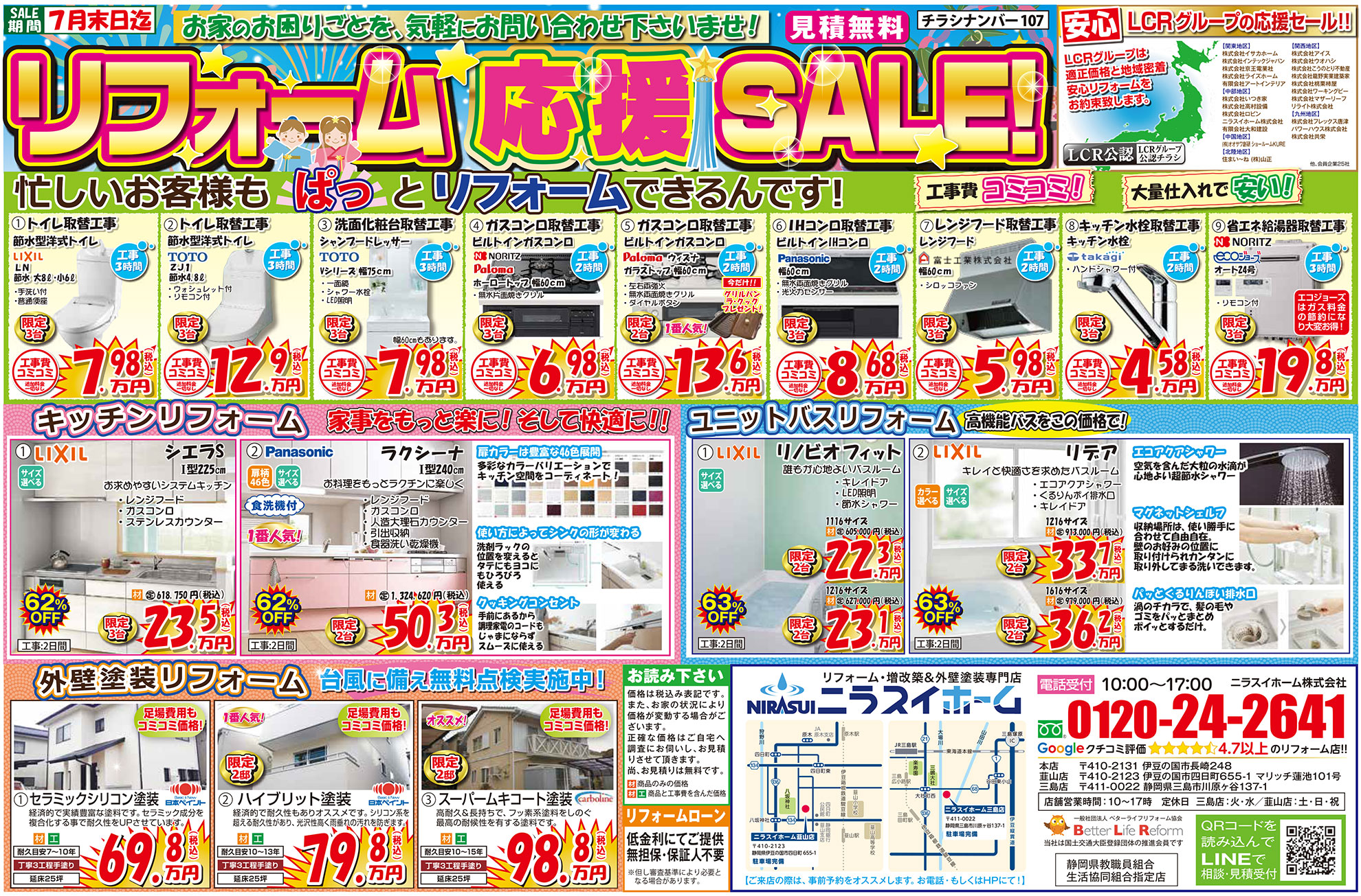 リフォーム価格 屋根診断 来店申し込み 韮山店 三島店 閉じる HOMEイベント情報チラシ【7月末までの期間限定】リフォーム応援セールチラシです! EVENTS 【7月末までの期間限定】リフォーム応援セールチラシです!(終了しました) 1 即日対応! 地域密着型の強みを活かし、お電話頂いたら即日対応させていただきます。2 地域最安値 お客様に良いものを、よりお求めやすくご提供できるように、努力を重ねております。3 最長10年保証 商品と工事のW保証体制でお客様に安心してリフォームをご依頼いただける体制を整えています。4 責任施工 丸投げ工事は一切行いません!当社専属の職人と共に責任を持って家づくりに励んでいます。5 押売勧誘一切なし 無理な売り込みや、電話で営業をかけたりするような事は一切ありません。 一言 お見積り無料!まずはお電話下さい!! 必須お名前 必須電話番号 必須イベント名 任意参加希望日 —以下から選択してください— 任意会場名 任意参加人数 任意メールアドレス 任意郵便番号 住所検索 任意住所 任意お問い合わせ内容 ※お急ぎの方は、 直接 0120-24-2641(10:00~17:00)まで、お電話ください。 ※相談内容は個人情報保護法に適用いたします。 24時間以内に回答を心がけておりますが、相談内容等によって、 2〜3日かかる事もございますが御了承下さい。 お電話でもお気軽にどうぞ! 内容をご確認の上、よろしければ下記の「入力内容を確認する」ボタンを押して下さい。 個人情報利用目的 ・お客様のご要望に合わせたサービスを提供させていただくための各種ご連絡。 ・お問い合わせいただいたご質問への回答のご連絡。 尚、お客様から収集する個人情報は弊社の定めるプライバシーポリシーに則って厳重に管理いたします。 プライバシーポリシー 弊社では、利用者のみなさんの個人情報がきちんと守られることを、何よりも大切にしています。また、利用者ご本人への事前の許可なしに第三者に個人情報を配送作業以外に開示することは絶対にいたしません。 どんな些細な事でも結構です。ご相談、お見積もりなど、お気軽にご連絡下さい。上記メールフォームからご連絡いただくか、電話にてご連絡下さい。 必須マークがついている項目は必ずご記載下さい。(株)、(有)や丸囲み数字等の機種依存文字は、文字化けの原因となりますので、使用しないようお願いいたします。 チラシ一覧はこちら イベント情報一覧はこちら ニラスイホームについて 会社案内代表挨拶会社概要企業理念アクセスマップ 選ばれる理由 リフォームショールーム ニラスイホーム 伊豆の国韮山店 ニラスイホーム 三島店 スタッフ紹介 採用情報 求職者向け 社長インタビュー 施工事例 施工事例一覧 地域で選ぶ 三島市 沼津市 伊豆の国市 伊豆市 清水町 長泉町 函南町 熱海市 伊東市 御殿場市 リフォームの種類で選ぶ フルリフォーム・リノベーション 水回り3点・4点リフォーム キッチンリフォーム 風呂・浴室リフォーム トイレ・便器の交換リフォーム 洗面台リフォーム エコキュート・給湯器の故障・修理・交換 IHクッキングヒーター・ガスコンロ 内装リフォーム 和室リフォーム 押入れ・クローゼット 建具・内装ドア 玄関ドアの交換 内窓・窓サッシ交換 外壁屋根塗装・外壁補修 外壁サイディング工事 屋根修理・葺き替え ベランダ・バルコニー防水 雨どい交換 外構エクステリア(サンルーム、テラス、ウッドデッキ) 駐車場・カーポート 配管修理・交換 その他 物件種別で選ぶ 一戸建て マンション・アパートのリフォーム 店舗・工場・倉庫、オフィス・事務所 お客様の声 お客様の声一覧 お役立ち情報 節約リフォーム ¥97,900(税込) 浴室 ¥35,200~(税込) TOTO ¥51,260~(税込) キッチン ¥177,100 ~(税込) トイレ ¥97,900(税込) 洗面 ¥60,100(税込) 給湯器 ¥99,800(税込) エコキュート ¥282,700~(税込) 水まわりパック ¥658,000(税込) キッチン水栓 ¥62,920~(税込) 浴室用水栓 ¥23,000(税別) コンロ ¥20,240(税込) 換気扇 ¥11,253~(税込) 外壁・屋根塗装 ¥502,700(税込) 屋根葺き替え・カバー工法 ¥883,000(税込) 窓 ¥26,080~(税込) 玄関ドアの交換・取替リフォーム ¥261,800~(税込) ニラスイホームのリフォーム応援セール!お得に快適生活を手に入れよう! 三島・沼津・伊豆の国周辺でエコキュートの故障・修理・交換ならニラスイホーム ニラスイホームの水まわり4点パックキャンペーン 補助金を使ってお得に内窓リフォーム! マンション水まわり3点セットキャンペーン リフォーム費用・相場 LINEで簡単相談・見積もり 現場ブログ イベント・チラシ情報 バリアフリーリフォーム リフォーム価格表 キッチン 浴室 トイレ 洗面 外壁・屋根塗装 屋根診断 協力施工業者大募集 住宅省エネ2026キャンペーン 先進的窓リノベ2026事業 みらいエコ住宅2026事業 給湯省エネ2026事業 よくあるご質問 お問い合わせ お問い合わせ お見積もり ご来店申し込み LINEで簡単相談・見積もり 韮山店 三島店 © 2018 ニラスイホーム株式会社