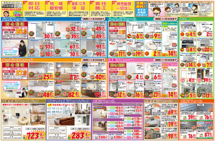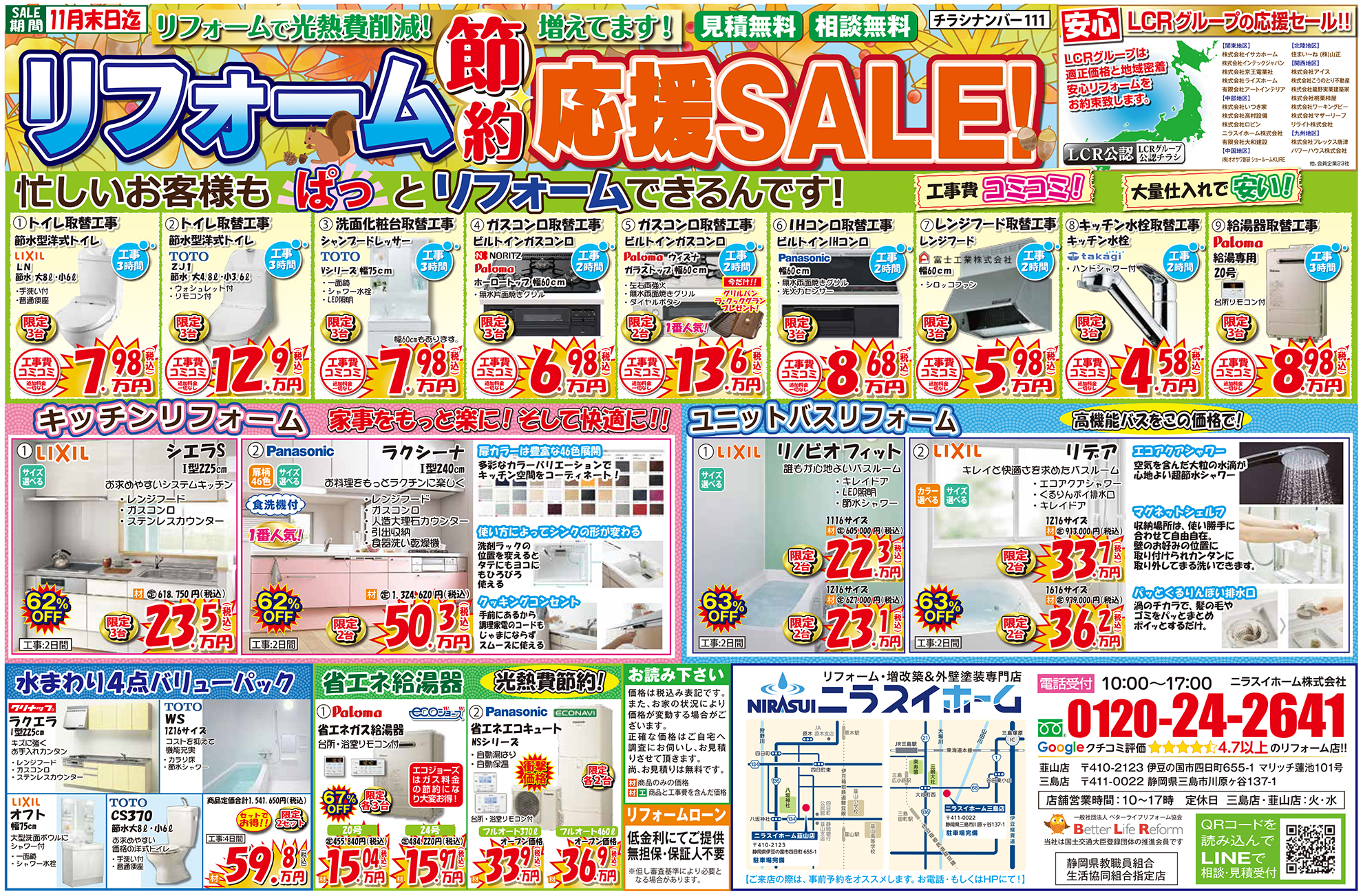 リフォーム価格 屋根診断 来店申し込み 韮山店 三島店 閉じる HOMEイベント情報チラシ【11月末までの期間限定】リフォーム節約応援セールチラシです! EVENTS 【11月末までの期間限定】リフォーム節約応援セールチラシです!(終了しました) 1 即日対応! 地域密着型の強みを活かし、お電話頂いたら即日対応させていただきます。2 地域最安値 お客様に良いものを、よりお求めやすくご提供できるように、努力を重ねております。3 最長10年保証 商品と工事のW保証体制でお客様に安心してリフォームをご依頼いただける体制を整えています。4 責任施工 丸投げ工事は一切行いません!当社専属の職人と共に責任を持って家づくりに励んでいます。5 押売勧誘一切なし 無理な売り込みや、電話で営業をかけたりするような事は一切ありません。 一言 お見積り無料!まずはお電話下さい!! チラシ一覧はこちら イベント情報一覧はこちら ニラスイホームについて 会社案内代表挨拶会社概要企業理念アクセスマップ 選ばれる理由 リフォームショールーム ニラスイホーム 伊豆の国韮山店 ニラスイホーム 三島店 スタッフ紹介 採用情報 求職者向け 社長インタビュー 施工事例 施工事例一覧 地域で選ぶ 三島市 沼津市 伊豆の国市 伊豆市 清水町 長泉町 函南町 熱海市 伊東市 御殿場市 リフォームの種類で選ぶ フルリフォーム・リノベーション 水回り3点・4点リフォーム キッチンリフォーム 風呂・浴室リフォーム トイレ・便器の交換リフォーム 洗面台リフォーム エコキュート・給湯器の故障・修理・交換 IHクッキングヒーター・ガスコンロ 内装リフォーム 和室リフォーム 押入れ・クローゼット 建具・内装ドア 玄関ドアの交換 内窓・窓サッシ交換 外壁屋根塗装・外壁補修 外壁サイディング工事 屋根修理・葺き替え ベランダ・バルコニー防水 雨どい交換 外構エクステリア(サンルーム、テラス、ウッドデッキ) 駐車場・カーポート 配管修理・交換 その他 物件種別で選ぶ 一戸建て マンション・アパートのリフォーム 店舗・工場・倉庫、オフィス・事務所 お客様の声 お客様の声一覧 お役立ち情報 節約リフォーム ¥97,900(税込) 浴室 ¥35,200~(税込) TOTO ¥51,260~(税込) キッチン ¥177,100 ~(税込) トイレ ¥97,900(税込) 洗面 ¥60,100(税込) 給湯器 ¥99,800(税込) エコキュート ¥282,700~(税込) 水まわりパック ¥658,000(税込) キッチン水栓 ¥62,920~(税込) 浴室用水栓 ¥23,000(税別) コンロ ¥20,240(税込) 換気扇 ¥11,253~(税込) 外壁・屋根塗装 ¥502,700(税込) 屋根葺き替え・カバー工法 ¥883,000(税込) 窓 ¥26,080~(税込) 玄関ドアの交換・取替リフォーム ¥261,800~(税込) ニラスイホームのリフォーム応援セール!お得に快適生活を手に入れよう! 三島・沼津・伊豆の国周辺でエコキュートの故障・修理・交換ならニラスイホーム ニラスイホームの水まわり4点パックキャンペーン 補助金を使ってお得に内窓リフォーム! マンション水まわり3点セットキャンペーン リフォーム費用・相場 LINEで簡単相談・見積もり 現場ブログ イベント・チラシ情報 バリアフリーリフォーム リフォーム価格表 キッチン 浴室 トイレ 洗面 外壁・屋根塗装 屋根診断 協力施工業者大募集 住宅省エネ2026キャンペーン 先進的窓リノベ2026事業 みらいエコ住宅2026事業 給湯省エネ2026事業 よくあるご質問 お問い合わせ お問い合わせ お見積もり ご来店申し込み LINEで簡単相談・見積もり 韮山店 三島店 © 2018 ニラスイホーム株式会社