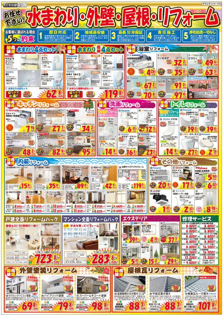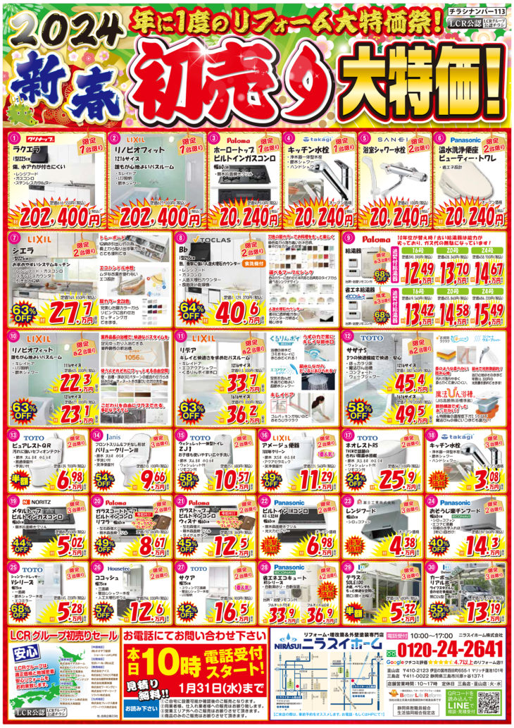 リフォーム価格 屋根診断 来店申し込み 韮山店 三島店 閉じる HOMEイベント情報チラシ【1月末までの期間限定】2024年新春初売り大特価セールチラシです! EVENTS 【1月末までの期間限定】2024年新春初売り大特価セールチラシです!(終了しました) 1 即日対応! 地域密着型の強みを活かし、お電話頂いたら即日対応させていただきます。2 地域最安値 お客様に良いものを、よりお求めやすくご提供できるように、努力を重ねております。3 最長10年保証 商品と工事のW保証体制でお客様に安心してリフォームをご依頼いただける体制を整えています。4 責任施工 丸投げ工事は一切行いません!当社専属の職人と共に責任を持って家づくりに励んでいます。5 押売勧誘一切なし 無理な売り込みや、電話で営業をかけたりするような事は一切ありません。 一言 お見積り無料!まずはお電話下さい!! チラシ一覧はこちら イベント情報一覧はこちら ニラスイホームについて 会社案内代表挨拶会社概要企業理念アクセスマップ 選ばれる理由 リフォームショールーム ニラスイホーム 伊豆の国韮山店 ニラスイホーム 三島店 スタッフ紹介 採用情報 求職者向け 社長インタビュー 施工事例 施工事例一覧 地域で選ぶ 三島市 沼津市 伊豆の国市 伊豆市 清水町 長泉町 函南町 熱海市 伊東市 御殿場市 リフォームの種類で選ぶ フルリフォーム・リノベーション 水回り3点・4点リフォーム キッチンリフォーム 風呂・浴室リフォーム トイレ・便器の交換リフォーム 洗面台リフォーム エコキュート・給湯器の故障・修理・交換 IHクッキングヒーター・ガスコンロ 内装リフォーム 和室リフォーム 押入れ・クローゼット 建具・内装ドア 玄関ドアの交換 内窓・窓サッシ交換 外壁屋根塗装・外壁補修 外壁サイディング工事 屋根修理・葺き替え ベランダ・バルコニー防水 雨どい交換 外構エクステリア(サンルーム、テラス、ウッドデッキ) 駐車場・カーポート 配管修理・交換 その他 物件種別で選ぶ 一戸建て マンション・アパートのリフォーム 店舗・工場・倉庫、オフィス・事務所 お客様の声 お客様の声一覧 お役立ち情報 節約リフォーム ¥97,900(税込) 浴室 ¥35,200~(税込) TOTO ¥51,260~(税込) キッチン ¥177,100 ~(税込) トイレ ¥97,900(税込) 洗面 ¥60,100(税込) 給湯器 ¥99,800(税込) エコキュート ¥282,700~(税込) 水まわりパック ¥658,000(税込) キッチン水栓 ¥62,920~(税込) 浴室用水栓 ¥23,000(税別) コンロ ¥20,240(税込) 換気扇 ¥11,253~(税込) 外壁・屋根塗装 ¥502,700(税込) 屋根葺き替え・カバー工法 ¥883,000(税込) 窓 ¥26,080~(税込) 玄関ドアの交換・取替リフォーム ¥261,800~(税込) ニラスイホームのリフォーム応援セール!お得に快適生活を手に入れよう! 三島・沼津・伊豆の国周辺でエコキュートの故障・修理・交換ならニラスイホーム ニラスイホームの水まわり4点パックキャンペーン 補助金を使ってお得に内窓リフォーム! マンション水まわり3点セットキャンペーン リフォーム費用・相場 LINEで簡単相談・見積もり 現場ブログ イベント・チラシ情報 バリアフリーリフォーム リフォーム価格表 キッチン 浴室 トイレ 洗面 外壁・屋根塗装 屋根診断 協力施工業者大募集 住宅省エネ2026キャンペーン 先進的窓リノベ2026事業 みらいエコ住宅2026事業 給湯省エネ2026事業 よくあるご質問 お問い合わせ お問い合わせ お見積もり ご来店申し込み LINEで簡単相談・見積もり 韮山店 三島店 © 2018 ニラスイホーム株式会社