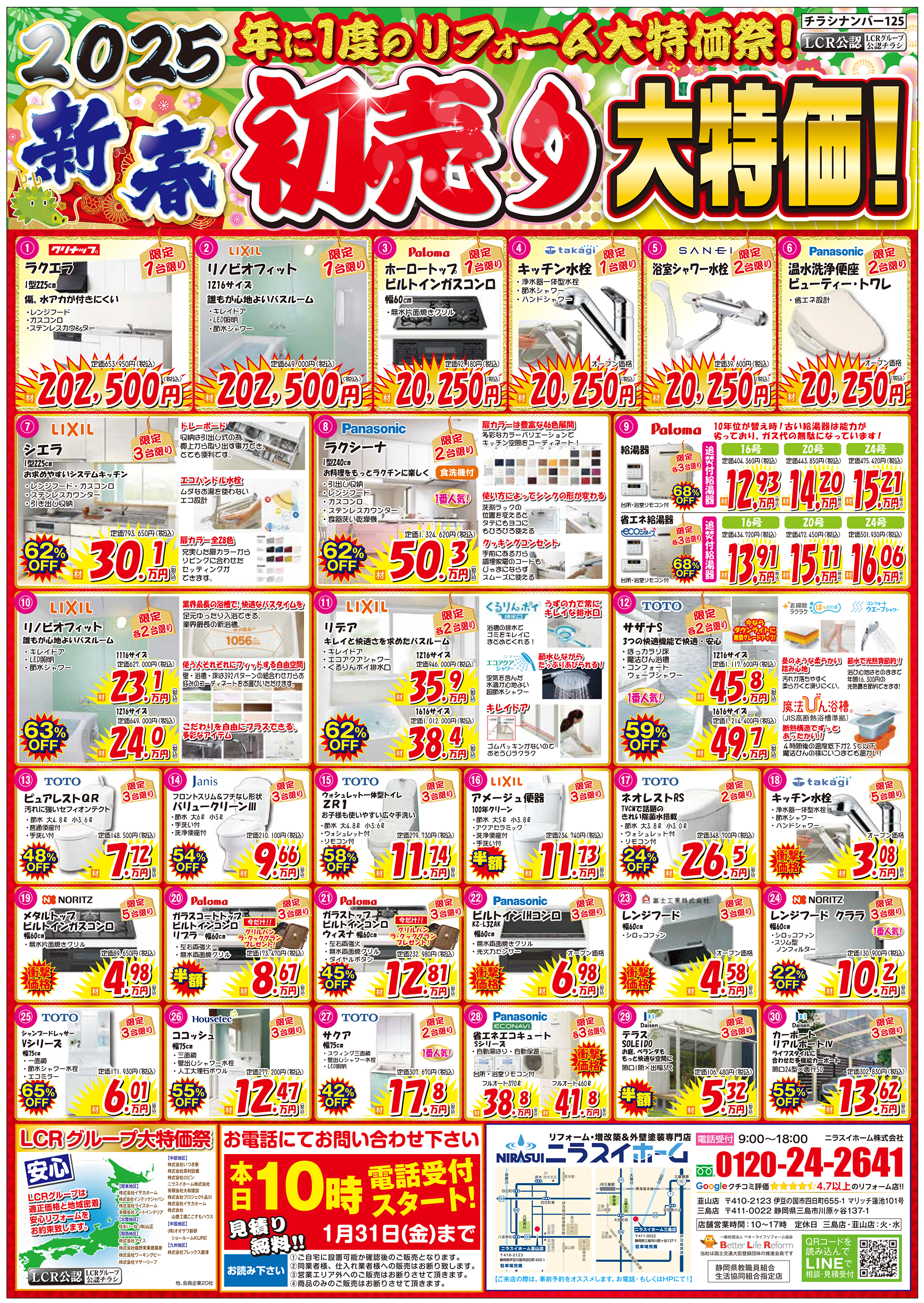 リフォーム価格 屋根診断 来店申し込み 韮山店 三島店 閉じる HOMEイベント情報チラシ【1月末までの期間限定】新春初売り大特価セールチラシです! EVENTS 【1月末までの期間限定】新春初売り大特価セールチラシです!(終了しました) 1 即日対応! 地域密着型の強みを活かし、お電話頂いたら即日対応させていただきます。2 地域最安値 お客様に良いものを、よりお求めやすくご提供できるように、努力を重ねております。3 最長10年保証 商品と工事のW保証体制でお客様に安心してリフォームをご依頼いただける体制を整えています。4 責任施工 丸投げ工事は一切行いません!当社専属の職人と共に責任を持って家づくりに励んでいます。5 押売勧誘一切なし 無理な売り込みや、電話で営業をかけたりするような事は一切ありません。 一言 お見積り無料!まずはお電話下さい!! 必須お名前 必須電話番号 必須イベント名 任意参加希望日 —以下から選択してください— 任意会場名 任意参加人数 任意メールアドレス 任意郵便番号 住所検索 任意住所 任意お問い合わせ内容 ※お急ぎの方は、 直接 0120-24-2641(10:00~17:00)まで、お電話ください。 ※相談内容は個人情報保護法に適用いたします。 24時間以内に回答を心がけておりますが、相談内容等によって、 2〜3日かかる事もございますが御了承下さい。 お電話でもお気軽にどうぞ! 内容をご確認の上、よろしければ下記の「入力内容を確認する」ボタンを押して下さい。 個人情報利用目的 ・お客様のご要望に合わせたサービスを提供させていただくための各種ご連絡。 ・お問い合わせいただいたご質問への回答のご連絡。 尚、お客様から収集する個人情報は弊社の定めるプライバシーポリシーに則って厳重に管理いたします。 プライバシーポリシー 弊社では、利用者のみなさんの個人情報がきちんと守られることを、何よりも大切にしています。また、利用者ご本人への事前の許可なしに第三者に個人情報を配送作業以外に開示することは絶対にいたしません。 どんな些細な事でも結構です。ご相談、お見積もりなど、お気軽にご連絡下さい。上記メールフォームからご連絡いただくか、電話にてご連絡下さい。 必須マークがついている項目は必ずご記載下さい。(株)、(有)や丸囲み数字等の機種依存文字は、文字化けの原因となりますので、使用しないようお願いいたします。 チラシ一覧はこちら イベント情報一覧はこちら ニラスイホームについて 会社案内代表挨拶会社概要企業理念アクセスマップ 選ばれる理由 リフォームショールーム ニラスイホーム 伊豆の国韮山店 ニラスイホーム 三島店 スタッフ紹介 採用情報 求職者向け 社長インタビュー 施工事例 施工事例一覧 地域で選ぶ 三島市 沼津市 伊豆の国市 伊豆市 清水町 長泉町 函南町 熱海市 伊東市 御殿場市 リフォームの種類で選ぶ フルリフォーム・リノベーション 水回り3点・4点リフォーム キッチンリフォーム 風呂・浴室リフォーム トイレ・便器の交換リフォーム 洗面台リフォーム エコキュート・給湯器の故障・修理・交換 IHクッキングヒーター・ガスコンロ 内装リフォーム 和室リフォーム 押入れ・クローゼット 建具・内装ドア 玄関ドアの交換 内窓・窓サッシ交換 外壁屋根塗装・外壁補修 外壁サイディング工事 屋根修理・葺き替え ベランダ・バルコニー防水 雨どい交換 外構エクステリア(サンルーム、テラス、ウッドデッキ) 駐車場・カーポート 配管修理・交換 その他 物件種別で選ぶ 一戸建て マンション・アパートのリフォーム 店舗・工場・倉庫、オフィス・事務所 お客様の声 お客様の声一覧 お役立ち情報 節約リフォーム ¥97,900(税込) 浴室 ¥35,200~(税込) TOTO ¥51,260~(税込) キッチン ¥177,100 ~(税込) トイレ ¥97,900(税込) 洗面 ¥60,100(税込) 給湯器 ¥99,800(税込) エコキュート ¥282,700~(税込) 水まわりパック ¥658,000(税込) キッチン水栓 ¥62,920~(税込) 浴室用水栓 ¥23,000(税別) コンロ ¥20,240(税込) 換気扇 ¥11,253~(税込) 外壁・屋根塗装 ¥502,700(税込) 屋根葺き替え・カバー工法 ¥883,000(税込) 窓 ¥26,080~(税込) 玄関ドアの交換・取替リフォーム ¥261,800~(税込) ニラスイホームのリフォーム応援セール!お得に快適生活を手に入れよう! 三島・沼津・伊豆の国周辺でエコキュートの故障・修理・交換ならニラスイホーム ニラスイホームの水まわり4点パックキャンペーン 補助金を使ってお得に内窓リフォーム! マンション水まわり3点セットキャンペーン リフォーム費用・相場 LINEで簡単相談・見積もり 現場ブログ イベント・チラシ情報 バリアフリーリフォーム リフォーム価格表 キッチン 浴室 トイレ 洗面 外壁・屋根塗装 屋根診断 協力施工業者大募集 住宅省エネ2026キャンペーン 先進的窓リノベ2026事業 みらいエコ住宅2026事業 給湯省エネ2026事業 よくあるご質問 お問い合わせ お問い合わせ お見積もり ご来店申し込み LINEで簡単相談・見積もり 韮山店 三島店 © 2018 ニラスイホーム株式会社