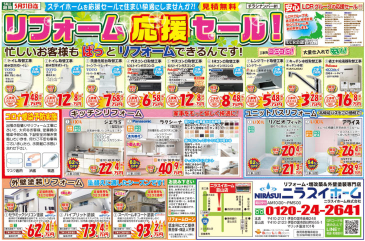 リフォーム価格 屋根診断 来店申し込み 韮山店 三島店 閉じる HOMEイベント情報チラシ2021年5月号 最新チラシです! EVENTS 2021年5月号 最新チラシです!(終了しました) 1 即日対応! 地域密着型の強みを活かし、お電話頂いたら即日対応させていただきます。2 地域最安値 お客様に良いものを、よりお求めやすくご提供できるように、努力を重ねております。3 最長10年保証 商品と工事のW保証体制でお客様に安心してリフォームをご依頼いただける体制を整えています。4 責任施工 丸投げ工事は一切行いません!当社専属の職人と共に責任を持って家づくりに励んでいます。5 押売勧誘一切なし 無理な売り込みや、電話で営業をかけたりするような事は一切ありません。 一言 お見積り無料!まずはお電話下さい!! 必須お名前 必須電話番号 必須イベント名 任意参加希望日 —以下から選択してください— 任意会場名 任意参加人数 任意メールアドレス 任意郵便番号 住所検索 任意住所 任意お問い合わせ内容 ※お急ぎの方は、 直接 0120-24-2641(10:00~17:00)まで、お電話ください。 ※相談内容は個人情報保護法に適用いたします。 24時間以内に回答を心がけておりますが、相談内容等によって、 2〜3日かかる事もございますが御了承下さい。 お電話でもお気軽にどうぞ! 内容をご確認の上、よろしければ下記の「入力内容を確認する」ボタンを押して下さい。 個人情報利用目的 ・お客様のご要望に合わせたサービスを提供させていただくための各種ご連絡。 ・お問い合わせいただいたご質問への回答のご連絡。 尚、お客様から収集する個人情報は弊社の定めるプライバシーポリシーに則って厳重に管理いたします。 プライバシーポリシー 弊社では、利用者のみなさんの個人情報がきちんと守られることを、何よりも大切にしています。また、利用者ご本人への事前の許可なしに第三者に個人情報を配送作業以外に開示することは絶対にいたしません。 どんな些細な事でも結構です。ご相談、お見積もりなど、お気軽にご連絡下さい。上記メールフォームからご連絡いただくか、電話にてご連絡下さい。 必須マークがついている項目は必ずご記載下さい。(株)、(有)や丸囲み数字等の機種依存文字は、文字化けの原因となりますので、使用しないようお願いいたします。 チラシ一覧はこちら イベント情報一覧はこちら ニラスイホームについて 会社案内代表挨拶会社概要企業理念アクセスマップ 選ばれる理由 リフォームショールーム ニラスイホーム 伊豆の国韮山店 ニラスイホーム 三島店 スタッフ紹介 採用情報 求職者向け 社長インタビュー 施工事例 施工事例一覧 地域で選ぶ 三島市 沼津市 伊豆の国市 伊豆市 清水町 長泉町 函南町 熱海市 伊東市 御殿場市 リフォームの種類で選ぶ フルリフォーム・リノベーション 水回り3点・4点リフォーム キッチンリフォーム 風呂・浴室リフォーム トイレ・便器の交換リフォーム 洗面台リフォーム エコキュート・給湯器の故障・修理・交換 IHクッキングヒーター・ガスコンロ 内装リフォーム 和室リフォーム 押入れ・クローゼット 建具・内装ドア 玄関ドアの交換 内窓・窓サッシ交換 外壁屋根塗装・外壁補修 外壁サイディング工事 屋根修理・葺き替え ベランダ・バルコニー防水 雨どい交換 外構エクステリア(サンルーム、テラス、ウッドデッキ) 駐車場・カーポート 配管修理・交換 その他 物件種別で選ぶ 一戸建て マンション・アパートのリフォーム 店舗・工場・倉庫、オフィス・事務所 お客様の声 お客様の声一覧 お役立ち情報 節約リフォーム ¥97,900(税込) 浴室 ¥35,200~(税込) TOTO ¥51,260~(税込) キッチン ¥177,100 ~(税込) トイレ ¥97,900(税込) 洗面 ¥60,100(税込) 給湯器 ¥99,800(税込) エコキュート ¥282,700~(税込) 水まわりパック ¥658,000(税込) キッチン水栓 ¥62,920~(税込) 浴室用水栓 ¥23,000(税別) コンロ ¥20,240(税込) 換気扇 ¥11,253~(税込) 外壁・屋根塗装 ¥502,700(税込) 屋根葺き替え・カバー工法 ¥883,000(税込) 窓 ¥26,080~(税込) 玄関ドアの交換・取替リフォーム ¥261,800~(税込) ニラスイホームのリフォーム応援セール!お得に快適生活を手に入れよう! 三島・沼津・伊豆の国周辺でエコキュートの故障・修理・交換ならニラスイホーム ニラスイホームの水まわり4点パックキャンペーン 補助金を使ってお得に内窓リフォーム! マンション水まわり3点セットキャンペーン リフォーム費用・相場 LINEで簡単相談・見積もり 現場ブログ イベント・チラシ情報 バリアフリーリフォーム リフォーム価格表 キッチン 浴室 トイレ 洗面 外壁・屋根塗装 屋根診断 協力施工業者大募集 住宅省エネ2026キャンペーン 先進的窓リノベ2026事業 みらいエコ住宅2026事業 給湯省エネ2026事業 よくあるご質問 お問い合わせ お問い合わせ お見積もり ご来店申し込み LINEで簡単相談・見積もり 韮山店 三島店 © 2018 ニラスイホーム株式会社