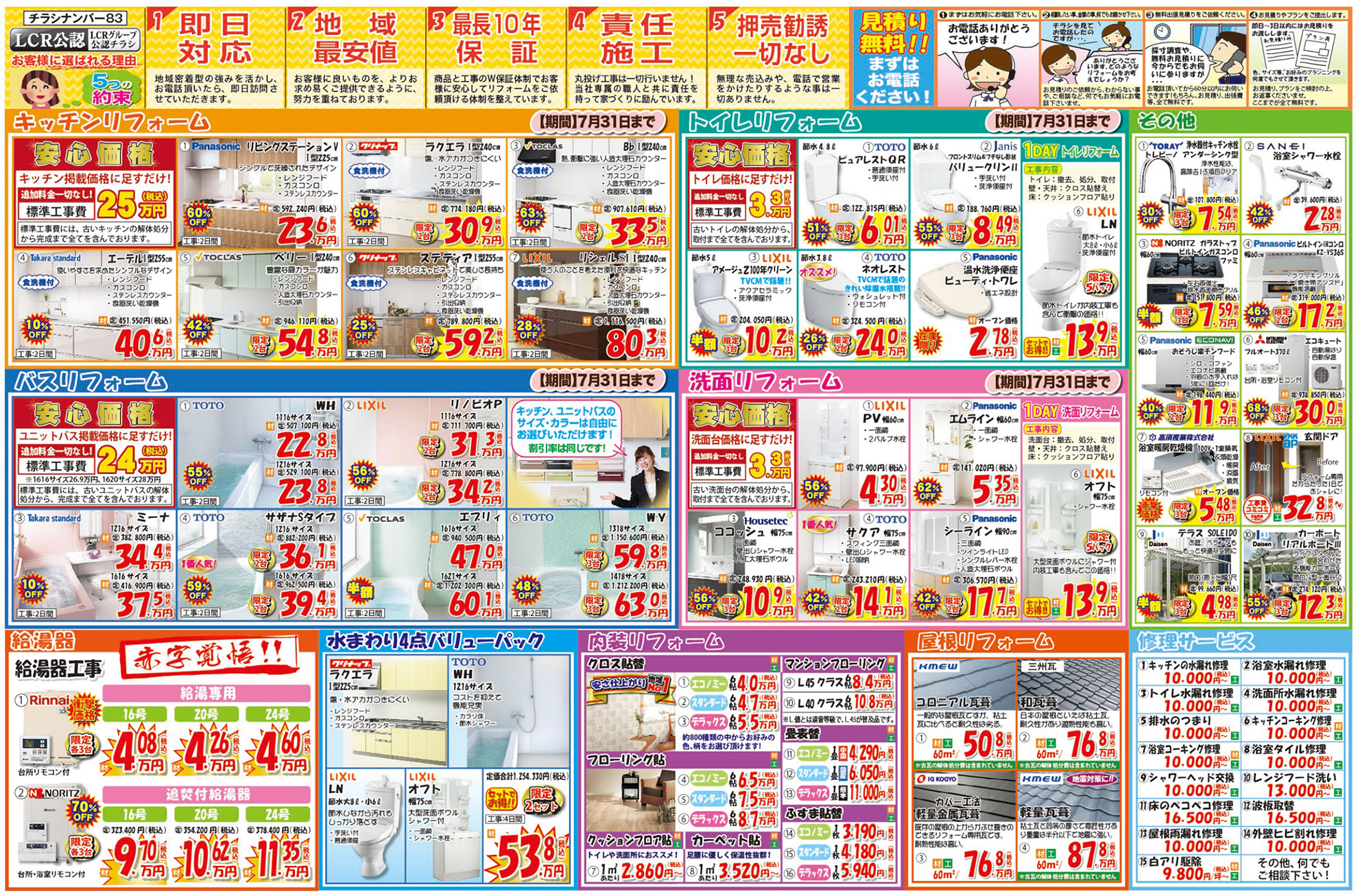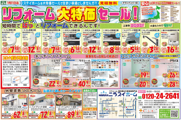 リフォーム価格 屋根診断 来店申し込み 韮山店 三島店 閉じる HOMEイベント情報チラシ2021年7月号 最新チラシです! EVENTS 2021年7月号 最新チラシです!(終了しました) 1 即日対応! 地域密着型の強みを活かし、お電話頂いたら即日対応させていただきます。2 地域最安値 お客様に良いものを、よりお求めやすくご提供できるように、努力を重ねております。3 最長10年保証 商品と工事のW保証体制でお客様に安心してリフォームをご依頼いただける体制を整えています。4 責任施工 丸投げ工事は一切行いません!当社専属の職人と共に責任を持って家づくりに励んでいます。5 押売勧誘一切なし 無理な売り込みや、電話で営業をかけたりするような事は一切ありません。 一言 お見積り無料!まずはお電話下さい!! 必須お名前 必須電話番号 必須イベント名 任意参加希望日 —以下から選択してください— 任意会場名 任意参加人数 任意メールアドレス 任意郵便番号 住所検索 任意住所 任意お問い合わせ内容 ※お急ぎの方は、 直接 0120-24-2641(10:00~17:00)まで、お電話ください。 ※相談内容は個人情報保護法に適用いたします。 24時間以内に回答を心がけておりますが、相談内容等によって、 2〜3日かかる事もございますが御了承下さい。 お電話でもお気軽にどうぞ! 内容をご確認の上、よろしければ下記の「入力内容を確認する」ボタンを押して下さい。 個人情報利用目的 ・お客様のご要望に合わせたサービスを提供させていただくための各種ご連絡。 ・お問い合わせいただいたご質問への回答のご連絡。 尚、お客様から収集する個人情報は弊社の定めるプライバシーポリシーに則って厳重に管理いたします。 プライバシーポリシー 弊社では、利用者のみなさんの個人情報がきちんと守られることを、何よりも大切にしています。また、利用者ご本人への事前の許可なしに第三者に個人情報を配送作業以外に開示することは絶対にいたしません。 どんな些細な事でも結構です。ご相談、お見積もりなど、お気軽にご連絡下さい。上記メールフォームからご連絡いただくか、電話にてご連絡下さい。 必須マークがついている項目は必ずご記載下さい。(株)、(有)や丸囲み数字等の機種依存文字は、文字化けの原因となりますので、使用しないようお願いいたします。 チラシ一覧はこちら イベント情報一覧はこちら ニラスイホームについて 会社案内代表挨拶会社概要企業理念アクセスマップ 選ばれる理由 リフォームショールーム ニラスイホーム 伊豆の国韮山店 ニラスイホーム 三島店 スタッフ紹介 採用情報 求職者向け 社長インタビュー 施工事例 施工事例一覧 地域で選ぶ 三島市 沼津市 伊豆の国市 伊豆市 清水町 長泉町 函南町 熱海市 伊東市 御殿場市 リフォームの種類で選ぶ フルリフォーム・リノベーション 水回り3点・4点リフォーム キッチンリフォーム 風呂・浴室リフォーム トイレ・便器の交換リフォーム 洗面台リフォーム エコキュート・給湯器の故障・修理・交換 IHクッキングヒーター・ガスコンロ 内装リフォーム 和室リフォーム 押入れ・クローゼット 建具・内装ドア 玄関ドアの交換 内窓・窓サッシ交換 外壁屋根塗装・外壁補修 外壁サイディング工事 屋根修理・葺き替え ベランダ・バルコニー防水 雨どい交換 外構エクステリア(サンルーム、テラス、ウッドデッキ) 駐車場・カーポート 配管修理・交換 その他 物件種別で選ぶ 一戸建て マンション・アパートのリフォーム 店舗・工場・倉庫、オフィス・事務所 お客様の声 お客様の声一覧 お役立ち情報 節約リフォーム ¥97,900(税込) 浴室 ¥35,200~(税込) TOTO ¥51,260~(税込) キッチン ¥177,100 ~(税込) トイレ ¥97,900(税込) 洗面 ¥60,100(税込) 給湯器 ¥99,800(税込) エコキュート ¥282,700~(税込) 水まわりパック ¥658,000(税込) キッチン水栓 ¥62,920~(税込) 浴室用水栓 ¥23,000(税別) コンロ ¥20,240(税込) 換気扇 ¥11,253~(税込) 外壁・屋根塗装 ¥502,700(税込) 屋根葺き替え・カバー工法 ¥883,000(税込) 窓 ¥26,080~(税込) 玄関ドアの交換・取替リフォーム ¥261,800~(税込) ニラスイホームのリフォーム応援セール!お得に快適生活を手に入れよう! 三島・沼津・伊豆の国周辺でエコキュートの故障・修理・交換ならニラスイホーム ニラスイホームの水まわり4点パックキャンペーン 補助金を使ってお得に内窓リフォーム! マンション水まわり3点セットキャンペーン リフォーム費用・相場 LINEで簡単相談・見積もり 現場ブログ イベント・チラシ情報 バリアフリーリフォーム リフォーム価格表 キッチン 浴室 トイレ 洗面 外壁・屋根塗装 屋根診断 協力施工業者大募集 住宅省エネ2026キャンペーン 先進的窓リノベ2026事業 みらいエコ住宅2026事業 給湯省エネ2026事業 よくあるご質問 お問い合わせ お問い合わせ お見積もり ご来店申し込み LINEで簡単相談・見積もり 韮山店 三島店 © 2018 ニラスイホーム株式会社
