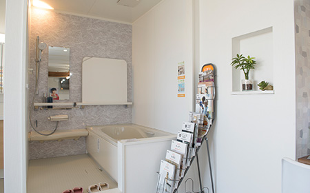 ユニットバスも実際に採用するものを原寸大で展示。浴槽に入ったりして広さを体感することができます。