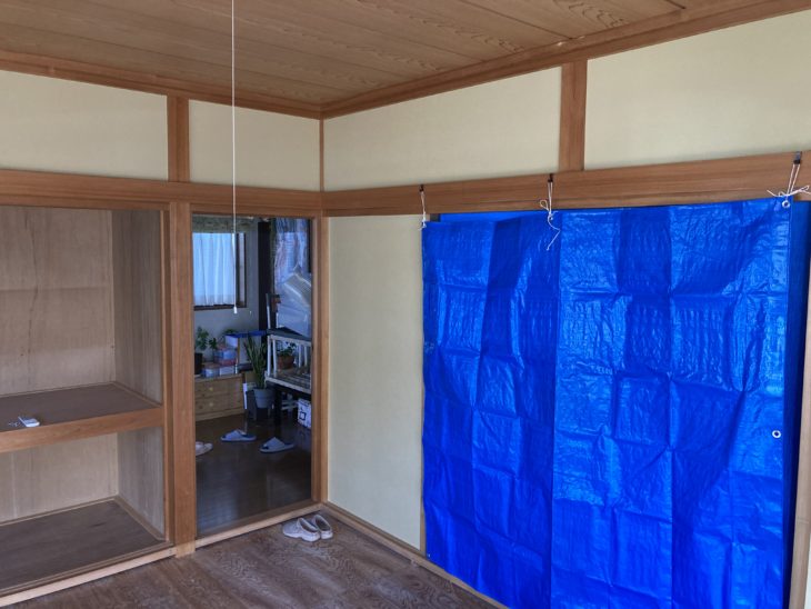 壁のクロス貼りが完了しました。襖は張り替えのため一度外しビニールシートで覆っておきます。
